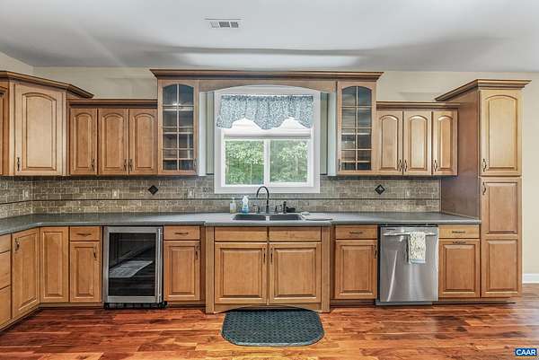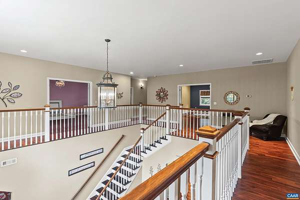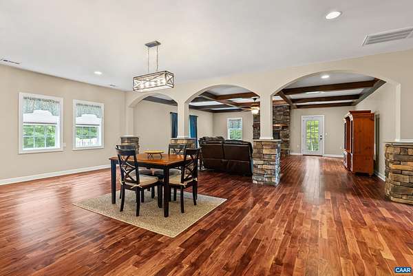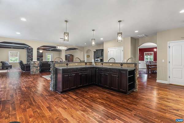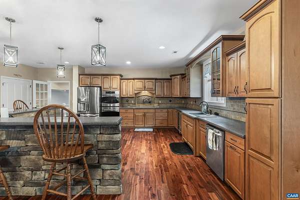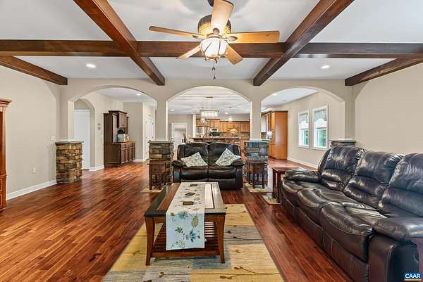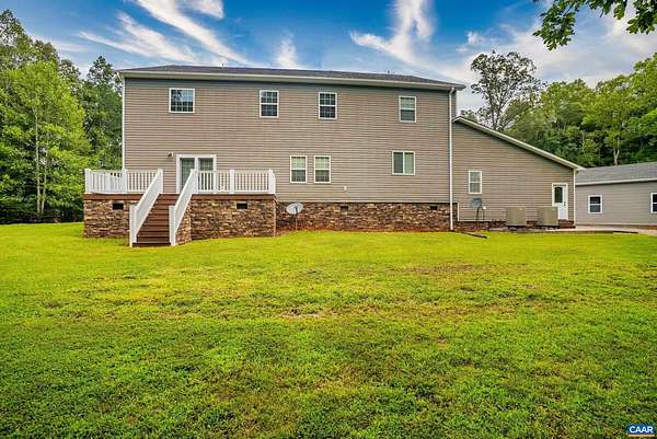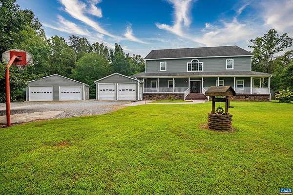 This meticulously constructed custom home is truly a one of a kind. Boasting over 5700 finished sq ft, nestled on almost 20 private acres and a small pond. This home is a dream with its grand foyer, open stair case and railings, massive room sizes, hardwood floors throughout, primary bedroom w/his and her closets, huge bath featuring custom shower, toilet closet, separate sink vanities - one with a dressing vanity, great room area that is wide open from the custom kitchen that includes tons of cabinets, granite and a stone faced island that matches the stone gas fireplace and columns in the den. There are so many upgrades in this home such as the coffered ceiling in the den, the picture frame molding in the dining room, 10 ft ceilings, composite decking on front/side porch and rear deck. There is also an attached 2 car garage and a detached 36 x 40 garage with electricity and 12 ft ceilings. You will have to visit the property to see everything it has to offer!!