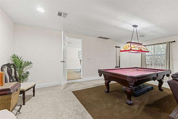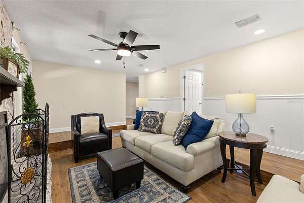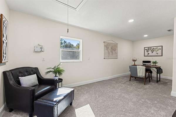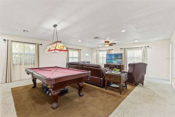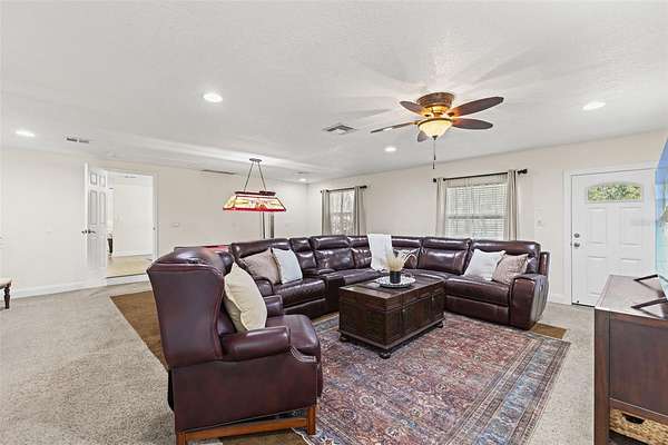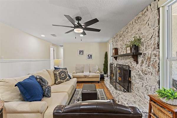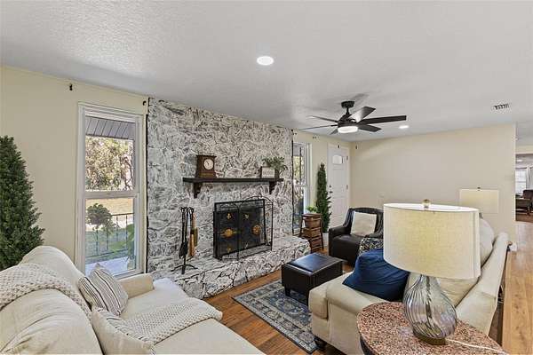 Step inside, where natural light is in abundance. The cozy living room, where a wood-burning fireplace forms the heart of the home, is perfect for relaxing on chilly evenings. The kitchen is a true centerpiece, boasting tons of cabinetry, granite countertops, stainless steel appliances, a breakfast bar and a single undermount sink positioned beneath a window with a picturesque view of the backyard and pool. The open dining area is ready and large enough for hosting memorable family gatherings. Adjacent to the kitchen, discover a versatile mudroom/laundry room and a MASSIVE family room, ideal for multi-generational living or a grand entertainment space, complete with its OWN SEPARATE ENTRANCE! The flexible office/studio space also features its own entrance, offering endless possibilities for a home business or private retreat.