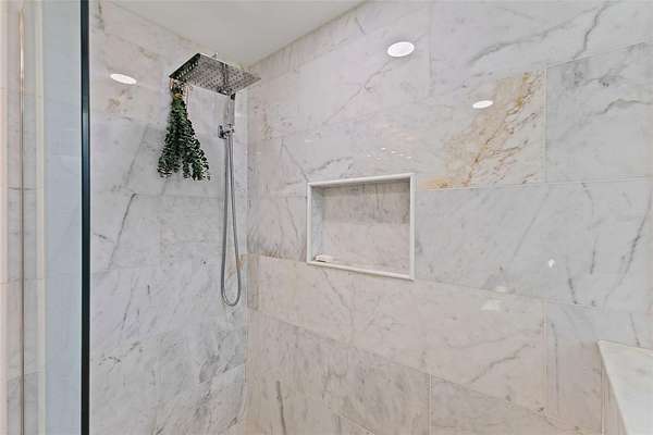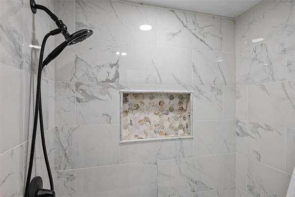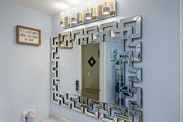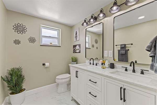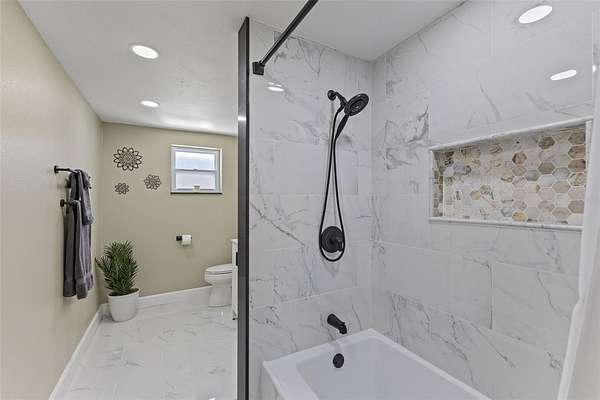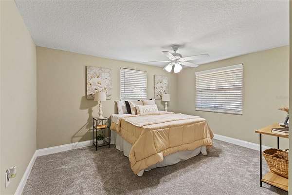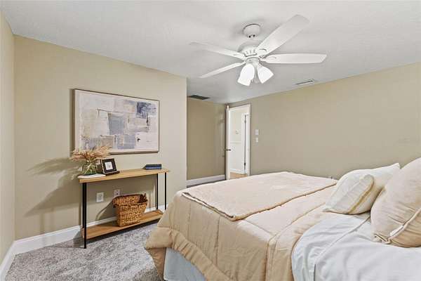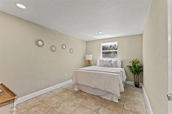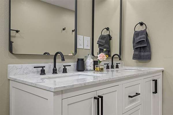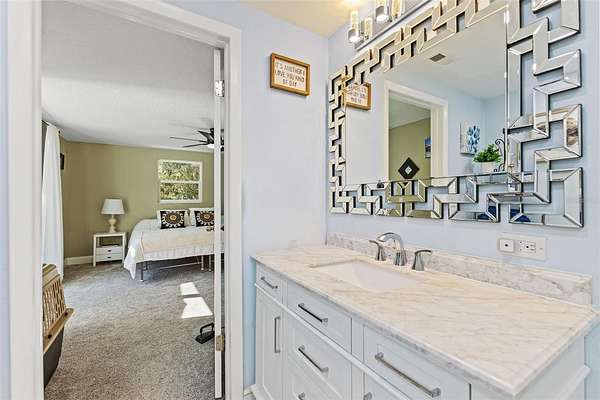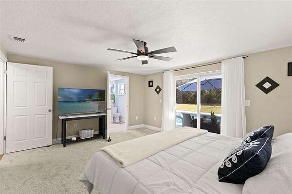 The primary bedroom is a serene escape with a walk-in closet and sliding glass doors that lead directly to the pool. Its en-suite bathroom has been stunningly remodeled for a spa-like experience. The guest bathroom is beautiful and has also been remodeled with double vanity sink and tub/shower combo. Three additional guest bedrooms, two with walk-in closets, one with armoire closet, provide comfort and privacy for family or visitors.
