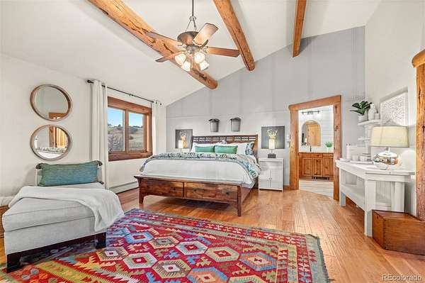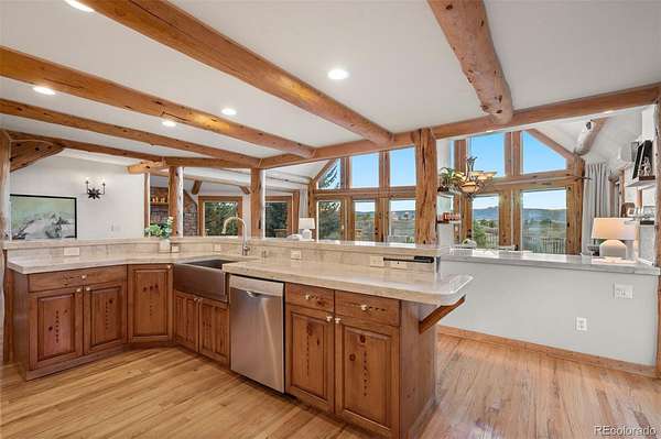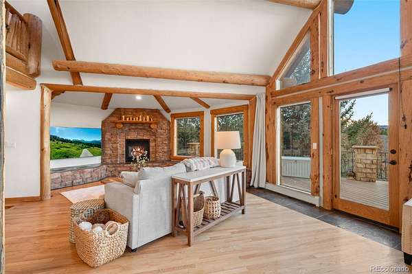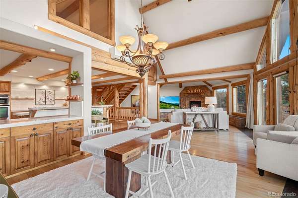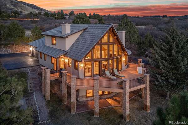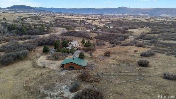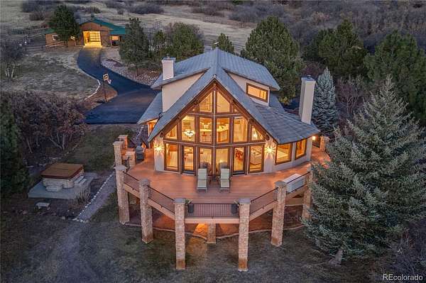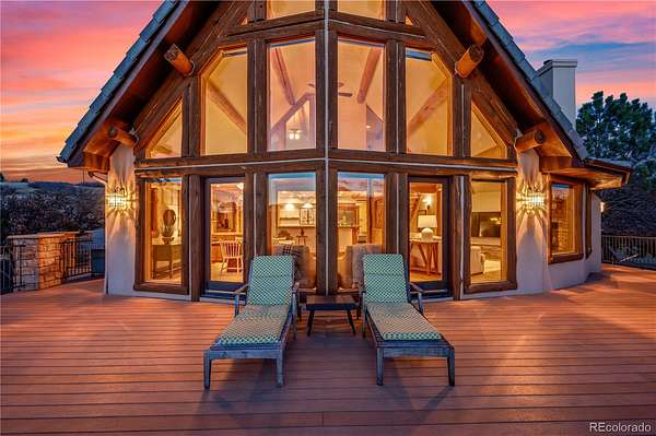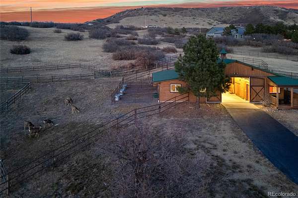 A distinguished offering within Sedalia’s coveted Bear Canyon Ranch, 1751 Big Bear Drive presents a rare opportunity to own a luxury mountain-contemporary equestrian estate in an exclusive private gated community, where refined design meets extraordinary natural beauty. Upon entering the peaceful timber frame home, you are immediately captivated by soaring vaulted ceilings and dramatic floor-to-ceiling, west-facing windows that frame uninterrupted panoramic views of the Rocky Mountains, where golden sunsets illuminate the horizon and native wildlife gather at the home’s private pond. Exquisite timber beams trace the vaulted ceilings from end to end, creating a sense of grandeur while infusing the home with natural warmth and refined craftsmanship. This exceptional property offers the rare combination of serene seclusion and effortless accessibility, just 7 minutes from downtown Castle Rock, with all roads fully paved to the residence, and paved driveway connecting the home to the barn. Four bedrooms and three spa-inspired updated bathrooms offer comfort and livability, while the elegantly remodeled kitchen showcases upscale finishes ideal for both entertaining and everyday luxury. An expansive wrap-around West-facing deck continues the living space outdoors, perfect for taking in Colorado’s serene mountain setting. Set on 15.49 usable acres, this exceptional property features premier equestrian amenities including a substantial 3-4 stall barn with attached climate-controlled office and porch, paddocks, fenced pasture, and riding corral, along with a hot tub set just outside the finished walk-out basement. Properties of this caliber within Bear Canyon Ranch are rarely available, making this a truly exceptional offering defined by peace, privacy, craftsmanship, and resort-style Colorado living.
