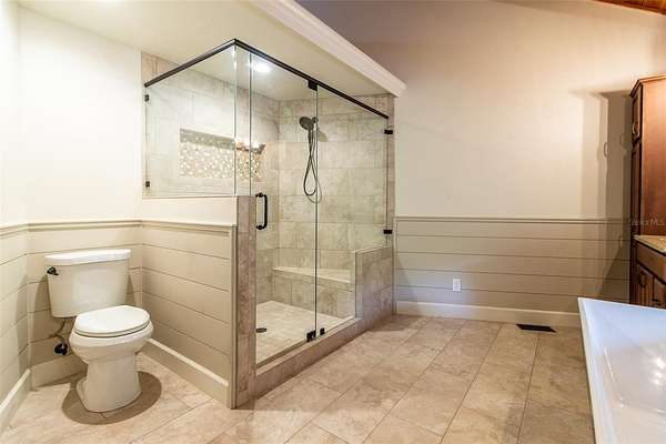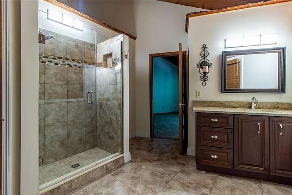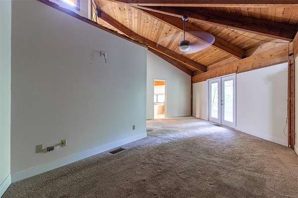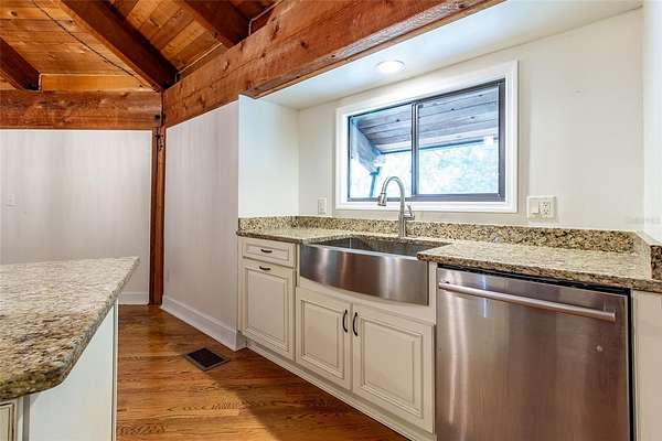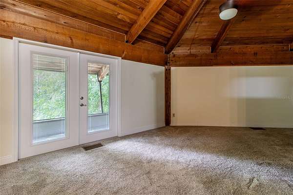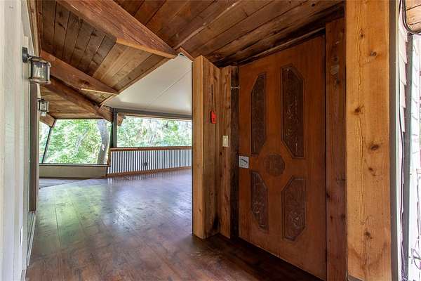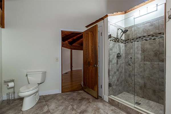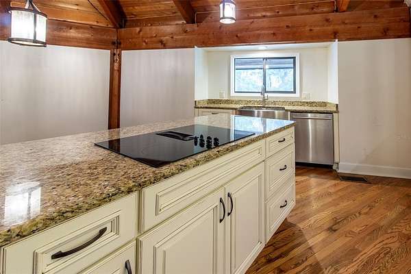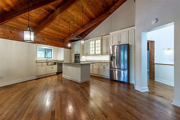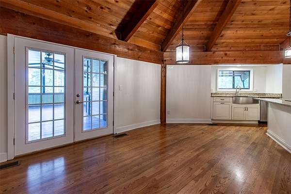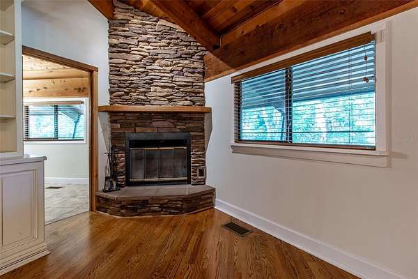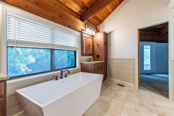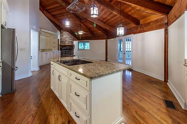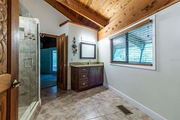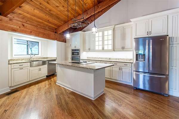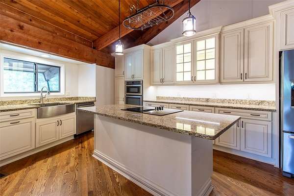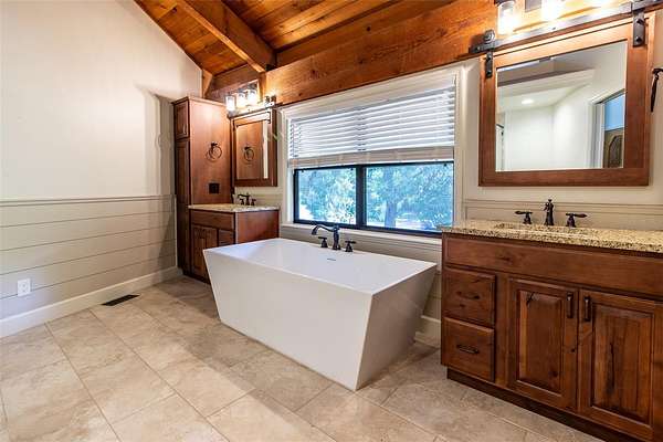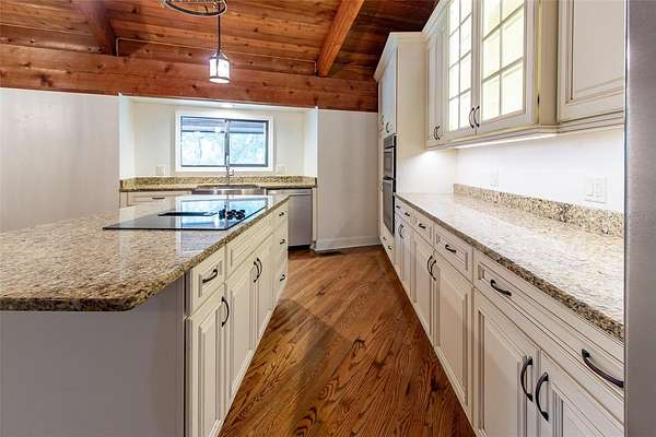 The kitchen features granite counters, a central island cooktop, farmhouse sink, and vaulted cedar ceiling with pendant lighting. The master suite enjoys its own vaulted ceiling, porch access, and an en-suite bath with a freestanding tub, walk-in shower, and dual vanities atop natural stone floors. Wrap around Balcony and upper deck gives amazing tranquil view of the grounds.