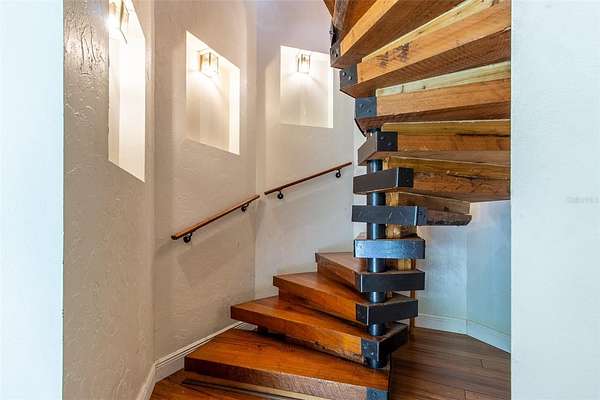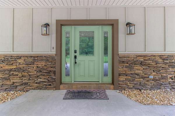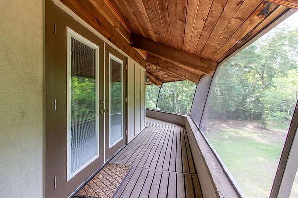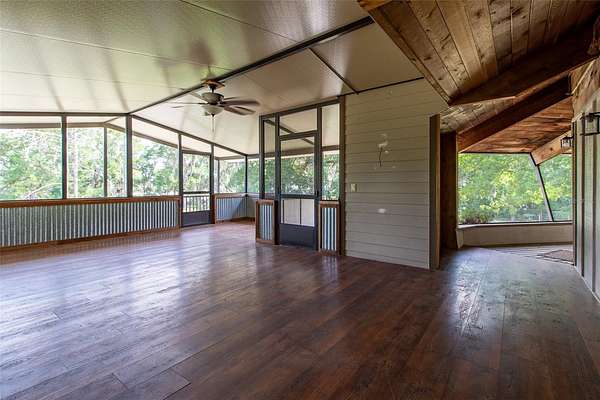 Inside, soaring cedar ceilings exposed beams and a spiral staircase guide you into a bright living room anchored by a stone fireplace and custom built-ins. Stained glass windows cast colorful light, hinting at the artistry throughout. Additionally the second story features a full wraparound porch that is screened yet open to gentle breezes - offering panoramic views of pasture and oaks.