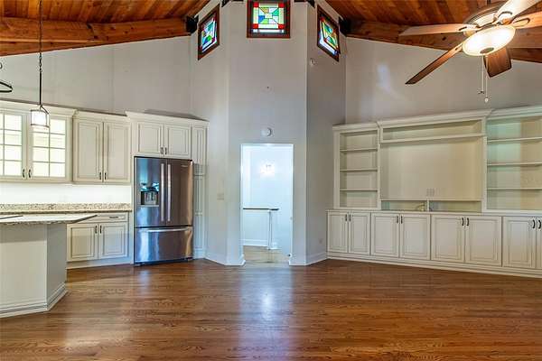 - Cathedral Ceiling(s), Ceiling Fans(s), Chair Rail, Crown Molding, Eat-In Kitchen, Elevator, High Ceilings, Open Floorplan, Solid Surface Counters, Solid Wood Cabinets, Thermostat, Vaulted Ceiling(s), Walk-In Closet(s)