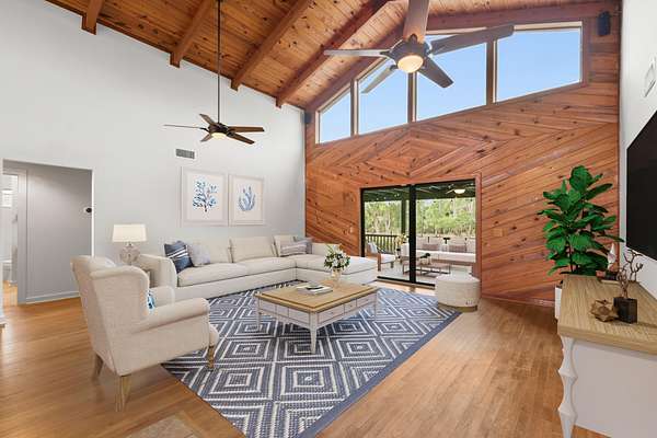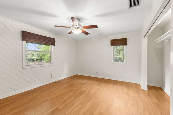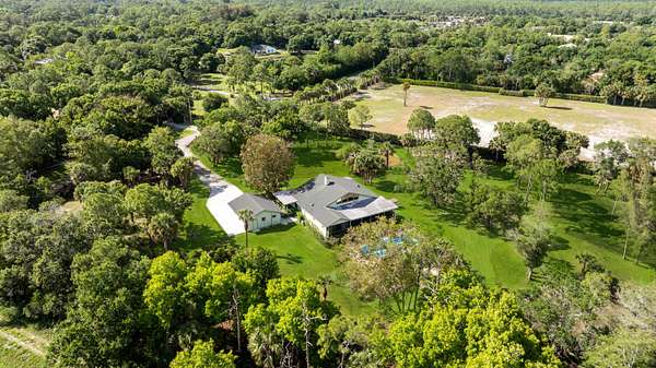 4.7 acres at the end of a paved road, one of the first streets in the farms. 4 bed, 3 bath, detached two-car garage. Less than 15 min to the beach, one mile to Publix. ANNUAL LEASE ONLY Vaulted pine ceilings, skylights, oak hardwood floors, new flooring throughout. Custom kitchen with double oven, island cooktop, and prep sink. Loft perfect for office space. 44x14 pool with travertine decking (2023). Covered screened patio. Nearly 5 acres of cleared land. Boats, RVs, trailers, horses welcome. Pool and lawn care included. Third full bath is in the detached garage.