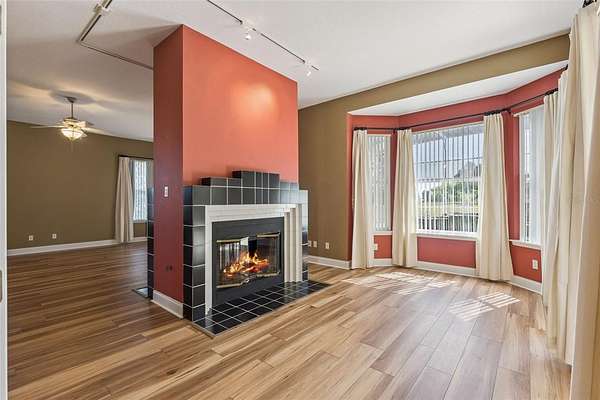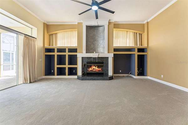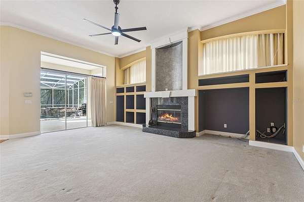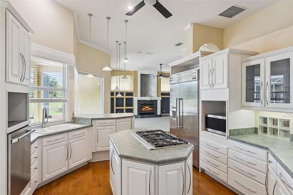 The oversized primary suite complete with a double-sided wood-burning fireplace for added warmth and ambiance with a sitting area on one side this is a true retreat. Two of the secondary bedrooms feature a convenient Jack-and-Jill bathroom layout, providing both privacy and functionality. An additional fireplace in the family room creates a cozy and inviting space perfect for gatherings with sliding door access to the pool area. The home is further enhanced by upscale thermador appliances including a double oven, gas cooktop, and refrigerator combining style and functionality for modern living. Enjoy the large lanai with an in ground heated pool, with a spa and waterfall feature. Bugs and debris kept away by the screen enclosure and a bamboo hedge for added privacy.