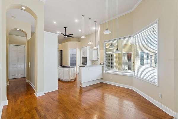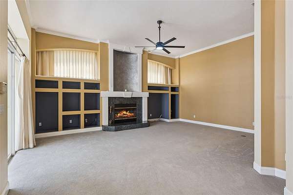 - Built-In Features, Ceiling Fans(s), Crown Molding, Eat-In Kitchen, Kitchen/Family Room Combo, Primary Bedroom Main Floor, Split Bedroom, Thermostat, Walk-In Closet(s), Window Treatments