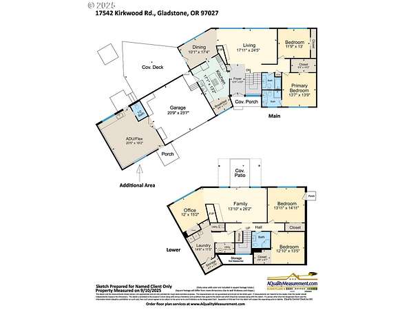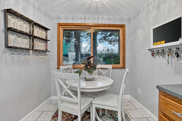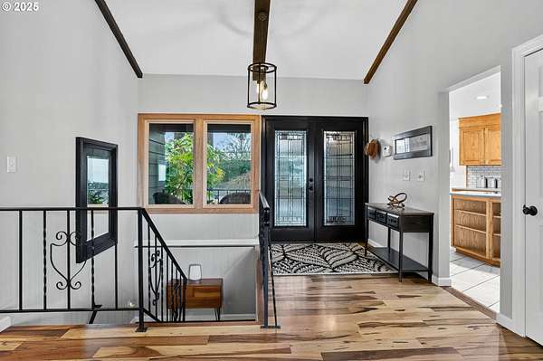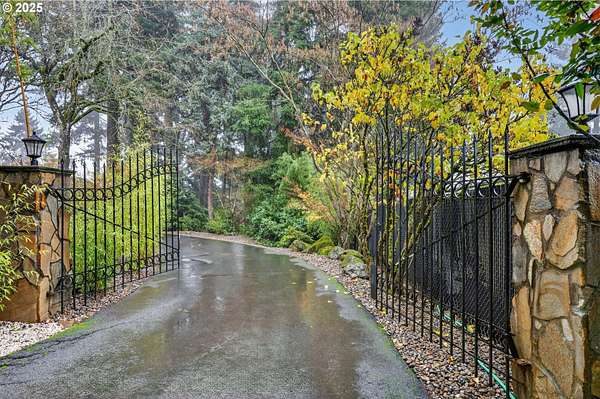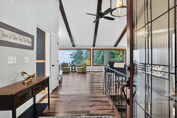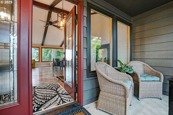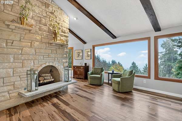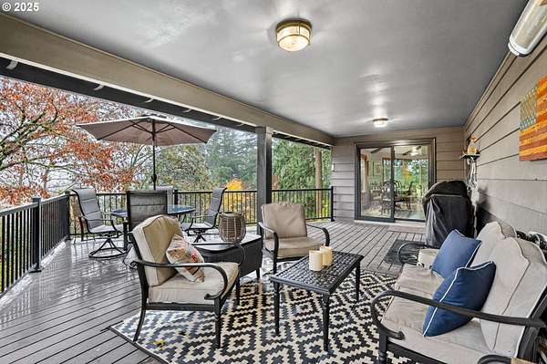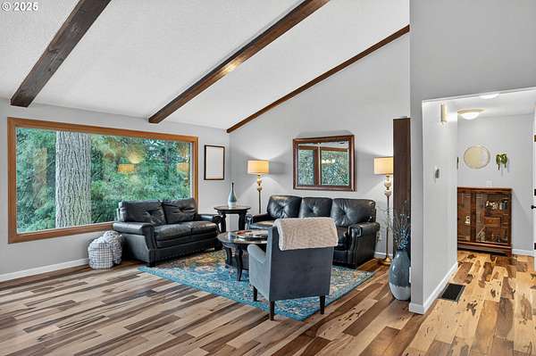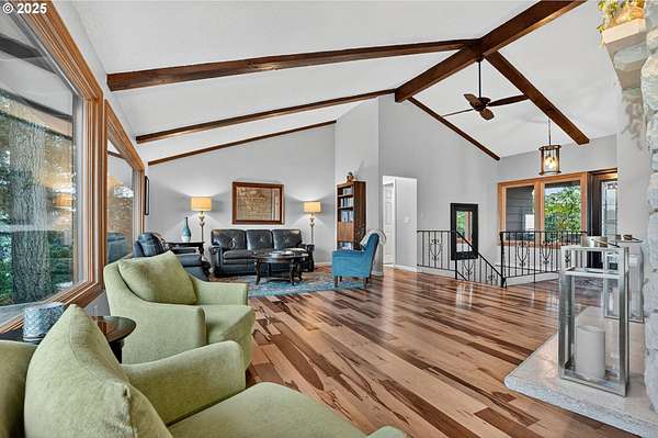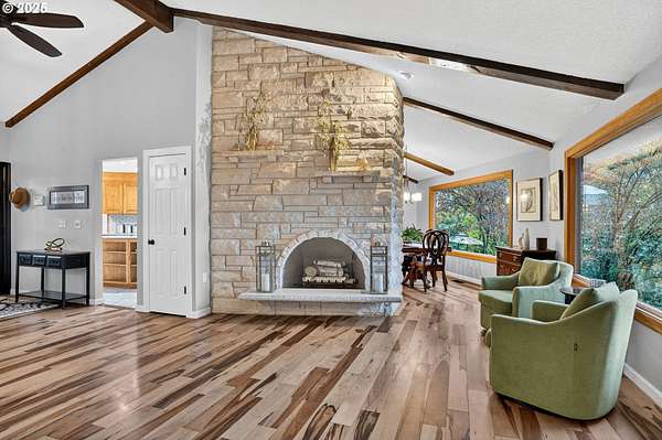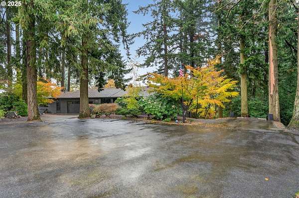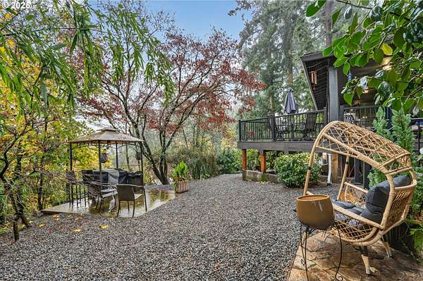 Secluded 2-acre wooded estate with breathtaking Mt. Hood views your private sanctuary awaits! This remodeled Mid-Century home blends timeless character with thoughtful, high-end updates. Step through the formal foyer into a light-filled living space with vaulted timber-beam ceilings, a wall of new Renewal by Andersen windows, and a cozy gas fireplace framed in white limestone. The open dining area flows effortlessly to the brand-new composite deck with metal railing perfect for morning coffee, summer BBQs, or a future hot tub overlooking the manicured yard and illuminated pergola. The chef's kitchen features sleek Quartz counters, KitchenAid convection oven + microwave, Jenn-Air downdraft cooktop, refurbished indoor Majestic Char-Grill gas BBQ, and oversized pantry. The main floor hosts a spacious primary suite with remodeled bath and walk-in closet, plus an additional bedroom and updated full bath. The daylight basement offers flexible living with two more bedrooms (one with exterior access), full bath, office space, large laundry room, and an oversized family room with second gas fireplace in petrified wood and agate with a slider to the private backyard. A separate 424 sq ft ADU with 10-ft ceilings, kitchenette, gas furnace, 1/2 bath, and plumbing for shower + water heater offers endless potential for a home business, studio, guest suite, or rental. Fence property includes a security gate, RV parking with electric + sewer hook-ups, and approximately $150K in merchantable timber. The 2-acre parcel may be partitioned or subdivided (buyer to verify); acreage is buildable. Clackamas county property not within Gladstone city limits. Conveniently located minutes from River access, Gladstone's shops, dining, and freeway access this rare estate offers serenity, versatility, and exceptional value. Welcome Home to 17542 Kirkwood Rd. Gladstone, OR 97027
