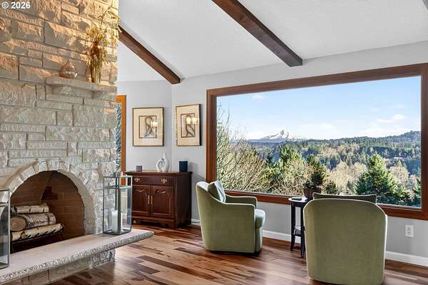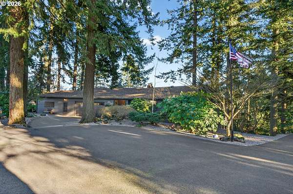 Secluded 2-acre wooded estate with breathtaking Mt. Hood views your private sanctuary awaits! This remodeled Mid-Century home blends timeless character with thoughtful, high-end updates. Step through the formal foyer into a light-filled living space with vaulted timber-beam ceilings, a wall of new Renewal by Andersen windows, and a cozy gas fireplace framed in white limestone. The open dining area flows effortlessly to the brand-new composite deck with metal railing perfect for morning coffee, summer BBQs, or a future hot tub overlooking the manicured yard and illuminated pergola. The chef's kitchen features sleek Quartz counters, KitchenAid convection oven + microwave, Jenn-Air downdraft cooktop, refurbished indoor Majestic Char-Grill gas BBQ, and oversized pantry. The main floor hosts a spacious primary suite with remodeled bath and walk-in closet, plus an additional bedroom and updated full bath. The daylight basement offers flexible living with two more bedrooms (one with exterior access), full bath, office space, large laundry room, and an oversized family room with second gas fireplace in petrified wood and agate with a slider to the private backyard. A separate 424 sq ft ADU with 10-ft ceilings, kitchenette, gas furnace, 1/2 bath, and plumbing for shower + water heater offers endless potential for a home business, studio, guest suite, or rental. Fence property includes a security gate, RV parking with electric + sewer hook-ups, large lot will park 10+ cars, and approximately $150K in merchantable timber. The 2-acre parcel may be partitioned or subdivided (buyer to verify); acreage is buildable. Clackamas county property not within Gladstone city limits. Conveniently located minutes from River access, Gladstone's shops, dining, and freeway access this rare estate offers serenity, versatility, and exceptional value. Welcome Home to 17542 Kirkwood Rd. Gladstone, OR 97027