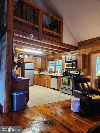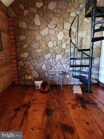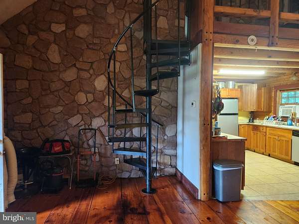 - 2 nd Kitchen, Ceiling Fan(s), Combination Kitchen/Living, Curved Staircase, Entry Level Bedroom, Exposed Beams, Open Floor Plan, Tub Shower Bathroom, Wood Floors, Wood Stove