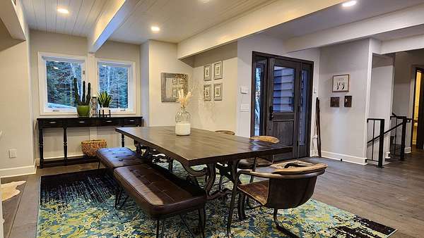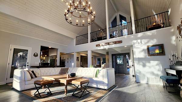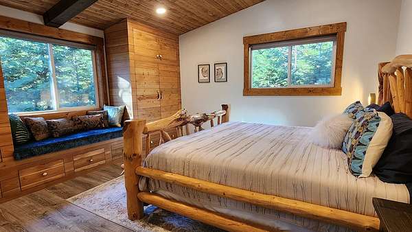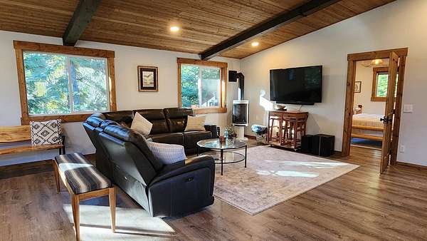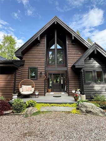 Swan Mountains reflect across Swan Lake into this exquisite, private waterfront home. Your nearly five acre setting leads down a sprawling lawn to 280 feet of premium beach frontage on the Westshore of Swan Lake. No expense was spared in the modernization of this light & bright contemporary five bedroom home. Complete main floor living with cozy fireplace. The lower level boasts a theater room and 4 bedrooms; upper level has a versatile loft space overlooking the Great Room. Adjoining is a full guest suite with kitchen & laundry with great lake and forest views featuring a primary bedroom plus a multi-bed bunkroom. So many custom touches! Toward the lake, across a suspension bridge, is a great getaway bunkhouse. At the lake is a storage bldg for lake toys & frig by lakefront deck, fire pit and gravel beach. At the driveway is power and water for an RV hook-up. Final necessity is the huge storage/toy barn across the road.
