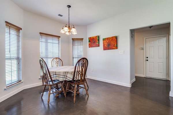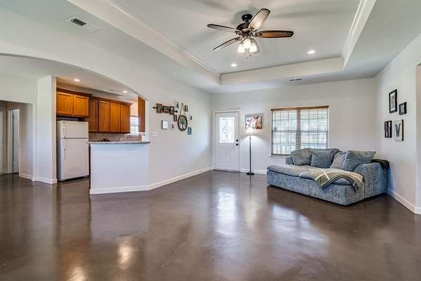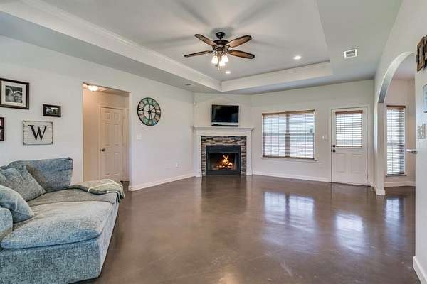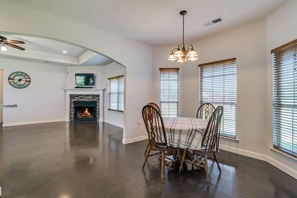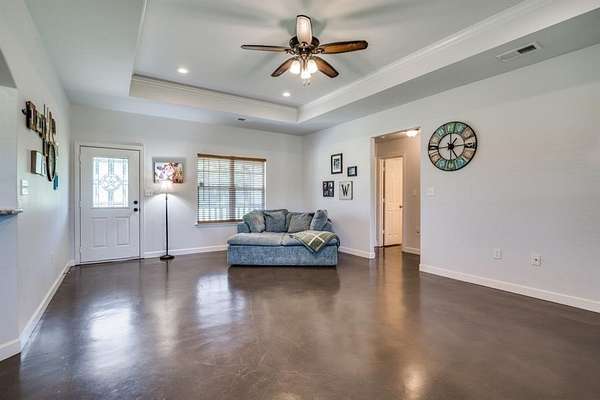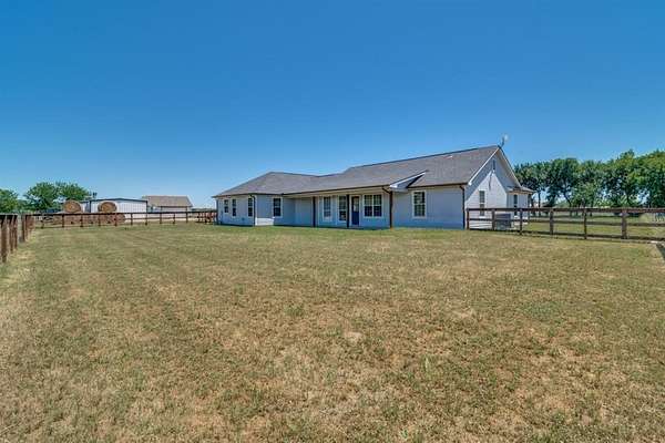 Escape the chaos of urban life and embrace the tranquility of country living. This stunning two-acre property features a spacious, fenced backyard and a barbed fence along its outer boundaries, providing ample space for farm animals. Picture yourself enjoying your morning coffee on the expansive covered front porch or hosting gatherings on cool evenings on the large back patio. This 3-bedroom,2-bathroom home boasts an open layout with a generous living area, a cozy fireplace, a gorgeous kitchen abundant cabinetry and countertops, a spacious master suite with a walk-in shower, a separate garden tub, and large walk-in closet. Stained concrete throughout. This home has been very well cared for and in tip top shape. Situated outside city limits with no restrictions, this property is located in the highly desirable Caddo Mills school district.