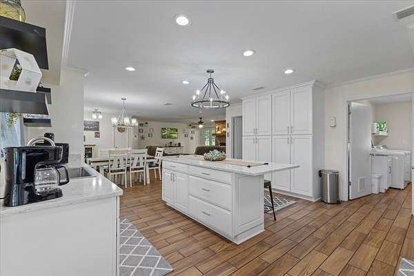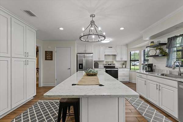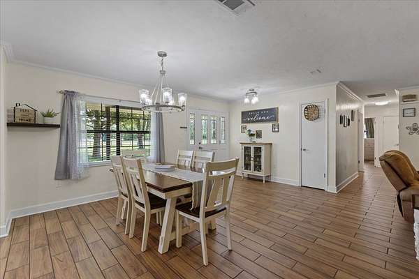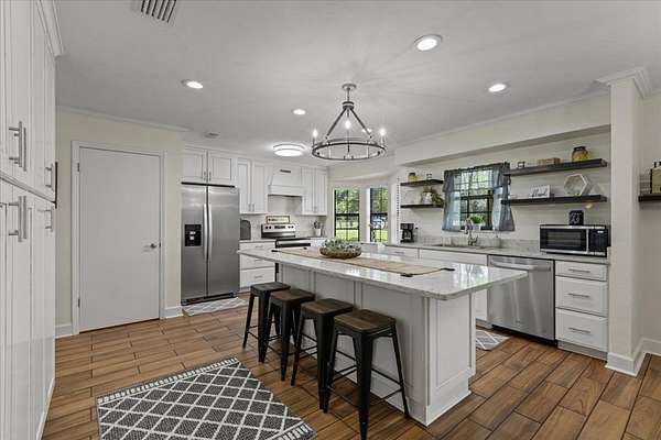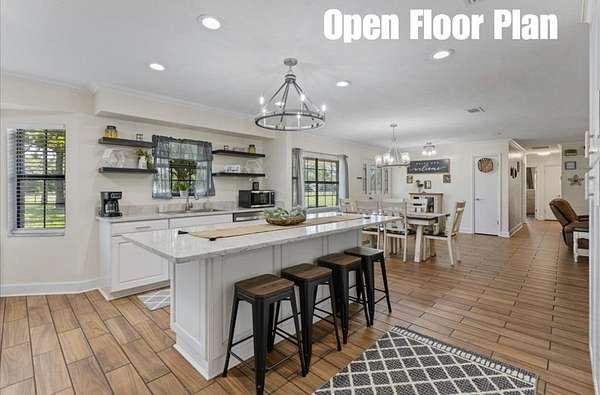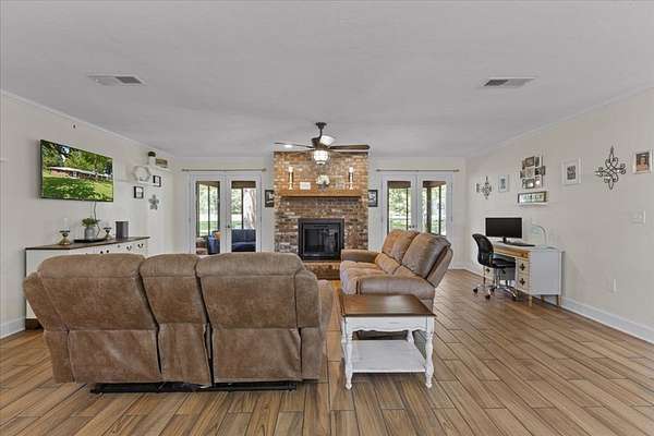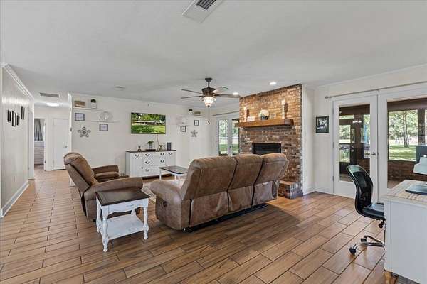 Driving up the quiet country road just outside Trenton, you'll find this fully remodeled 4-bedroom, 2.5-bath brick home sitting on 5 open acres. Inside, the layout is practical and spacious, starting with an open main living area anchored by a full brick fireplace. On either side, French doors lead into a fully enclosed and air-conditioned Florida room--ideal for relaxing year-round. The kitchen is built for both daily living and entertaining, with quartz countertops, stainless steel appliances, and a large center island that offers plenty of seating and prep space. Natural light pours in through oversized front-facing windows. The primary bedroom includes a large walk-in closet and a private bath with dual sinks and a stand-alone shower. The property extends well beyond the home itself. Out back, there's an above-ground pool, a fenced dog area, and two separate sheds for storage. With five acres to work with, there's plenty of space for gardening, animals, or future projects. The 2-car garage has a rear entry and connects easily to the main home. Located between Trenton and Chiefland, this property offers easy access to local stores and dining while still giving you the space and privacy of country living. Nearby, you'll find the Suwannee River, Hart Springs, and Otter Springs--all popular destinations for fishing, kayaking, and hiking. This part of Gilchrist County is known for its quiet pace, open skies, and strong sense of community. Call today to schedule your tour!