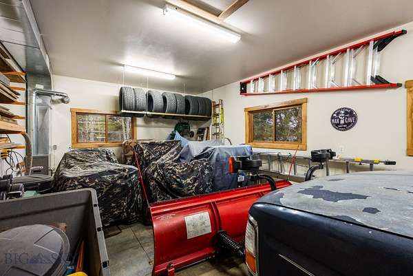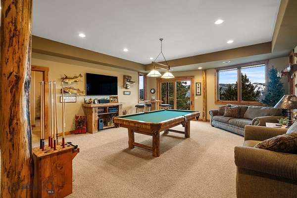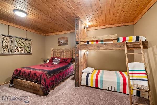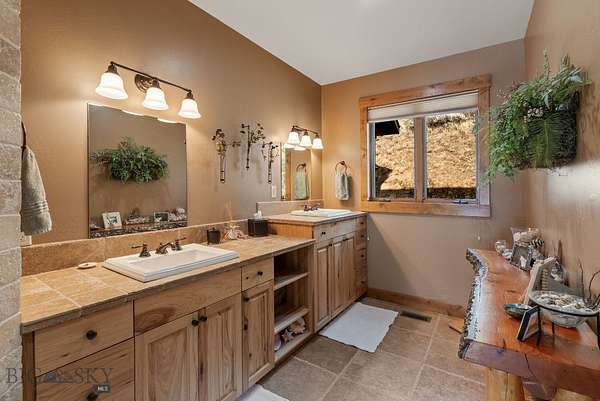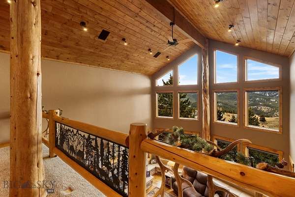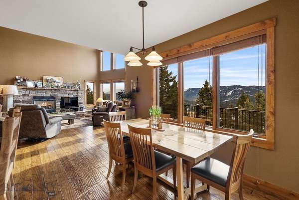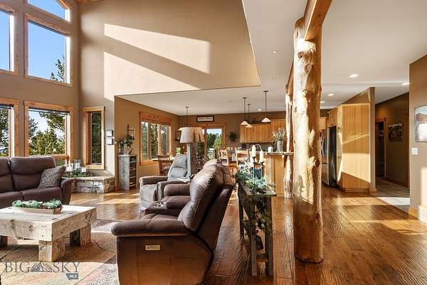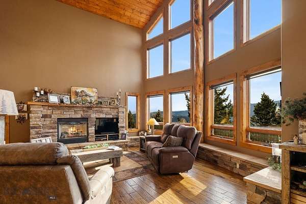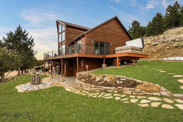 Your timeless Montana mountain retreat awaits in this stunning 4,280 sq ft custom home set on 13 pristine acres at approximately 6,000 feet in elevation. Positioned along the edge of a peaceful valley, this property offers a rare and immersive wildlife experience-where elk, deer, and native birds are frequent visitors, and each day feels like a private escape into nature. Designed across three levels with 23 foot soaring ceilings, including a dramatic loft, the home is anchored by a striking south-facing wall of glass that captures natural light and frames sweeping sunset views beyond downtown Bozeman-visible right from your deck. The main level features an expansive kitchen, dining area, and a luxurious primary suite complete with a private deck and hot tub overlooking the mountain landscape. Exceptional craftsmanship is showcased throughout, beginning with 6-inch hand-scraped birch flooring in the kitchen, knotty alder doors, and matching alder window, door, and baseboard trim. The kitchen features rustic hickory cabinetry, which continues throughout all bathrooms, as well as the mudroom, wine closet, and workshop. Locally harvested Douglas fir-sourced within two miles-has been crafted into the kitchen countertops and fireplace mantel, while exposed beams and stacked support posts add architectural character from the basement through the great room to the loft. Warm finishes continue with pine tongue-and-groove ceilings in the great room and downstairs bedrooms, a custom cherry bookcase in the loft, travertine tile in the primary bath, slate in the entryway, and barnwood accents in the bunk room. The lower level offers a spacious living and game room with walk-out access to a firepit and tranquil water feature. Outdoor living is equally impressive, with cedar siding, sandstone steps and walkways, and a stone fireplace seating area. High-quality Jeld-Wen windows and patio doors bring in light, while a dual heating system with Lennox forced air and radiant heat ensures comfort. A detached, heated 1,100 sq ft shop-currently used as a professional woodworking space-offers flexibility for hobbies, storage, or gear, with room for vehicles and toys. Conveniently located just 28 minutes from Main Street Bozeman, 38 minutes to Bridger Bowl, and 30 minutes to Livingston, with access to ATV trails in the Bangtail Mountains, this property offers the perfect balance of seclusion, accessibility, and elevated mountain living.