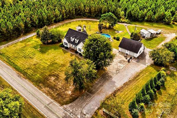 LOCATION, LOCATION, LOCATION! Welcome to this charming farmhouse in the country, offering peace, privacy, and convenience just minutes from the NC/SC line. This 3-bedroom, 2.5-bathroom home includes a spacious FROG (finished room above garage) with a massive walk-in closet, perfect for a home office, guest suite, or bonus living space. Inside, you'll find a well-maintained home with a new roof (2020) and an HVAC system only 5 years old. The kitchen is fully equipped, and all appliances-including washer and dryer-convey with the sale. The exterior is packed with amenities! A two-car attached garage is complemented by a 24x32 detached garage/workshop complete with a full kitchen, as well as a 12x16 storage building. Outdoors, enjoy an above-ground pool with a newly built deck, featuring a brand-new pump and ionizer-perfect for summer relaxation. Step out back to a covered patio, the ideal spot for entertaining guests or simply unwinding after a long day. For the outdoorsman, the property offers 4 cleared acres with the remaining land planted in pines and hardwoods, a shooting range, and a cleared spot for hunting/sportsman activities. This versatile farmhouse offers both comfort and recreation, blending rural charm with modern updates. Don't miss your chance to own this unique property in such a prime location!