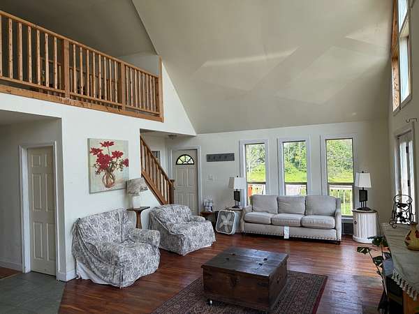 Est $1,494/moSpacious four bedroom A-frame situated on 6.6 acres. This home was built only 13 years ago. On the main floor are 3 BR's, 2 Bathrooms, large laundry room, kitchen, dinining area and LR. Upstairs are the loft and 4th BR Two sets of double doors lead out to the wrap around deck. Peaceful country setting.