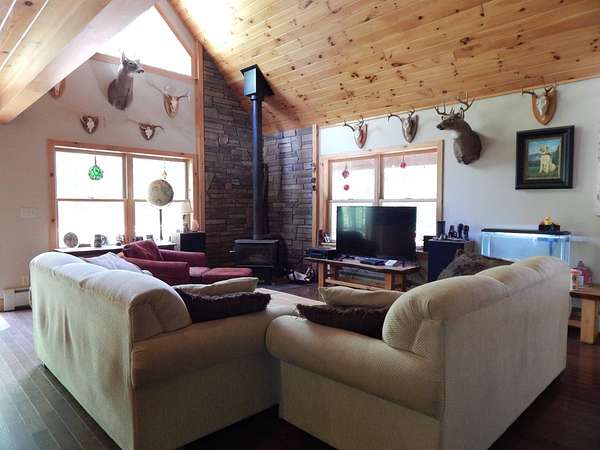 Est $4,177/moA Rare Find- Custom year round home with attached two stall garage located on 4.9 acres. Plenty of privacy yet right around the corner from the village. Birds Eye maple cabinets in kitchen and bathrooms and custom countertops. Custom wood work inside and out. Custom stone work behind woodstove. Covered porch wraps around to a large deck. Full walkout basement. 20x30 pole barn Home has an 20kw Briggs & Stratton automatic generator.Five zone hot water base board with radiant heat in garage and basement. Showings by appointment only. Pre-qual required. Seller is a licensed real estate broker.
