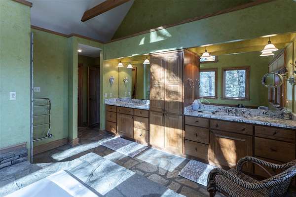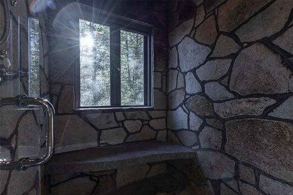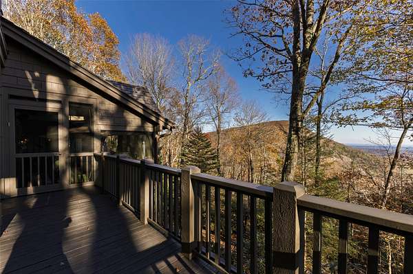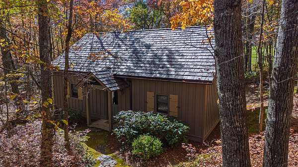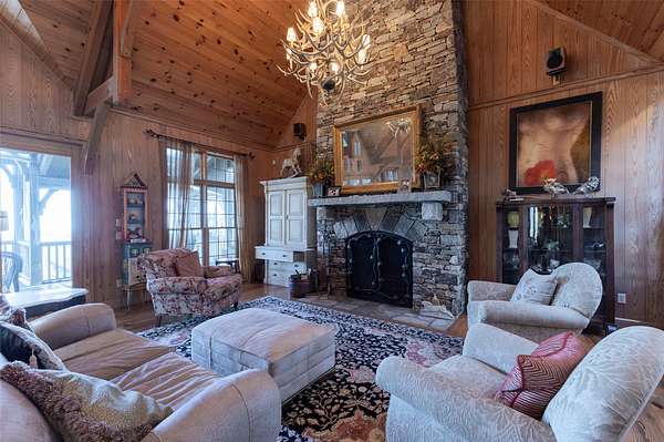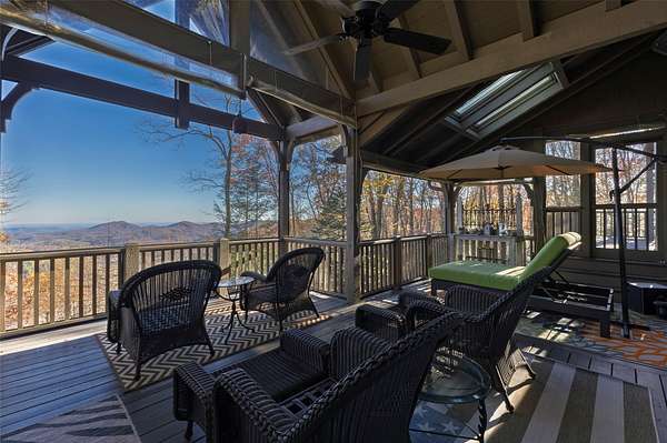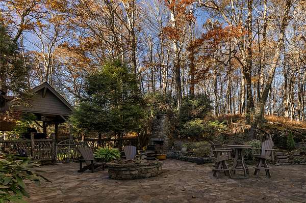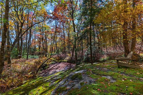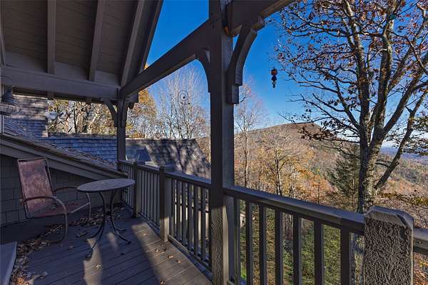 This stunning enclave presides over 14 acres of mountain land at an elevation of 4,160 feet and is perfect for a nature enthusiast seeking privacy and luxury. The property shares almost 2,000 feet of common boundary with Panthertown Valley-a treasured 6,311-acre backcountry recreation area featuring pristine streams and over 30 miles of trails within the Nantahala National Forest. This Divide at Bald Rock community home is accessed via a long private driveway marked by lighted stone pillars and a gated entry. Arriving at the home one passes trails, large mossy boulders and a stream fed pond created by a sloping native rock outcropping. Constructed with rustic yet elegant materials both inside and out, the main house features beautiful antique pine and native stone floors, wormy chestnut cabinets, a floor-to-ceiling stone fireplace in the great room and primary bedroom, and vaulted ceilings. Upon entering, the home immediately draws one toward the expansive southeast mountain view, visible from all major rooms. The common areas-including the great room, keeping room, kitchen, and den-are exceptionally spacious. The great room opens onto screened and open porches, all taking in the majesty of nature along with incredible views. A large stone terrace with outdoor fireplace is accessed from the gallery and the den, and is inside the large fenced area. The primary bedroom is on the main level and includes a stone gas log fireplace and a bathroom featuring stone floors, a stone-encased soaking tub, and shower. Above the primary bedroom, a large vaulted room has built-in cabinetry the length of the room. This space is ideal for home office, artist studio or exercise room. The upper level situated on the opposite side of the home features two sizable guest bedrooms, both with lovely views and a shared bathroom. Comfortable year 'round living is provided to the main house by a large generator. The naturally landscaped setting provides beautiful vignettes for wandering and relaxation. The property also includes a separate two-bedroom, two bath guest house with a small kitchen, situated far enough from the main house to ensure privacy for both residences. A large, freestanding two-bay garage offers ample natural daylight and workshop space. An adjoining lot is included with this purchase, creating an opportunity for a second guest house or additional development.