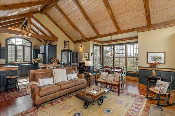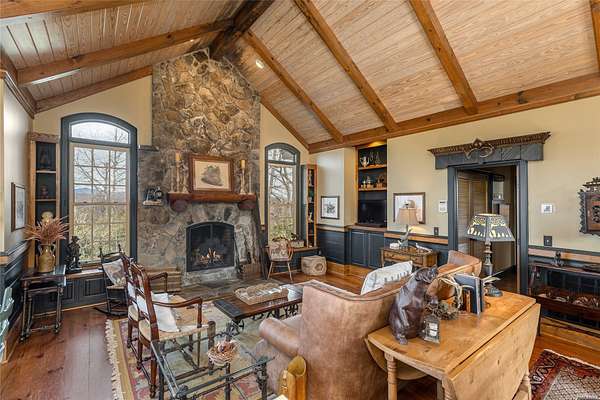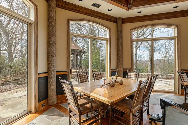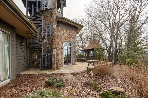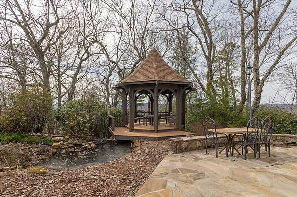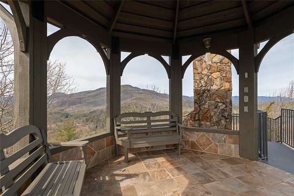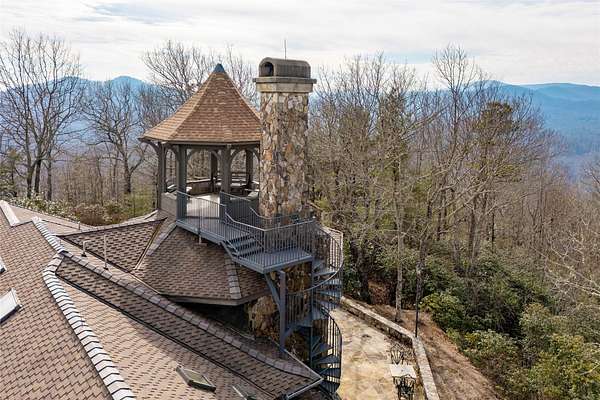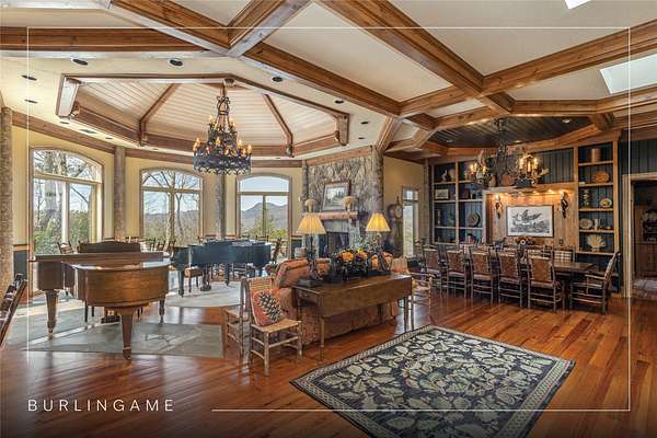 Perched on 7.68 acres at the highest point in Burlingame, this unique property offers outstanding, unobstructed 360-degree views. Chosen by the original developer for his own family home and guest house, this most unique property offers remarkable privacy, scale, and presence with many custom features throughout. Enter through the front door into a large foyer and seating area centered on a wood-burning fireplace and crowned by a raised octagonal ceiling with a massive light fixture. The main living area continues the octagonal theme and is anchored by a floor-to-ceiling masonry fireplace. Walls lined with wormy chestnut create warmth and character, while the expansive layout offers numerous entertaining possibilities. A commercial-grade kitchen supports gatherings of all sizes and reflects the home's history of hosting and hospitality. The flexible floor plan has most recently served as a training facility for religious leaders, yet it can easily be adapted into a substantial private residence. The fully equipped guest house includes two bedrooms with ensuite bathrooms, a full kitchen, a living room, and a dining area - each positioned to enjoy the incredible long-range views. Outdoor spaces are equally compelling, with a manmade water feature, gazebo, and sweeping grounds that take full advantage of the elevation. From outside the main house, ascend the spiral staircase to the cupola rising high above the roofline, where views extend for miles in every direction. Utilitarian details and acreage combine with architectural distinction to create a truly one-of-a-kind offering within the Burlingame community. Burlingame is a family-focused mountain community set at approximately 3,000 feet in Sapphire, North Carolina, offering a lifestyle that balances natural beauty, recreation, and connection. Winding roads, parks, hiking trails, fishing ponds, and trout waters create an inviting setting for time outdoors, while homes range from golf-course residences to riverfront and mountain-view retreats. At the heart of the community is Burlingame Country Club, featuring dining, social spaces, an 18-hole championship golf course, fitness facilities, tennis, pickleball, croquet, and a heated pool. Club membership is available upon application and approval and is not required for property ownership, allowing residents to enjoy Burlingame's relaxed, welcoming lifestyle at their own pace.