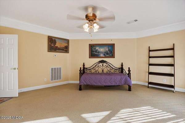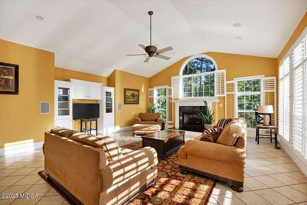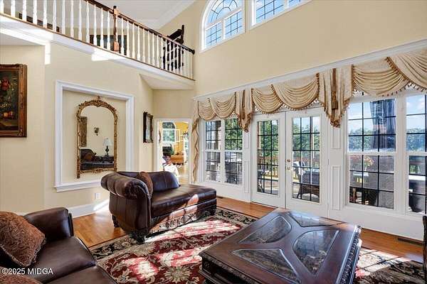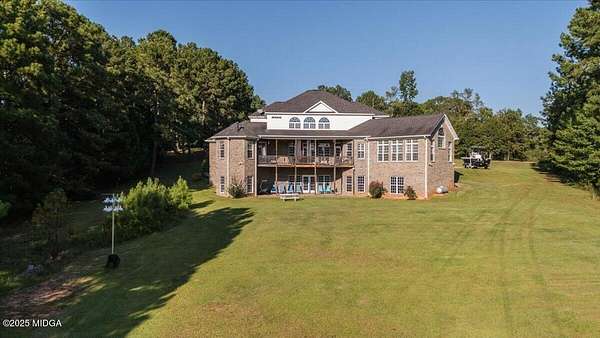 Riverfront estate on 4.2 acres located on a quiet cul-de-sac street in Jones County. This 4 bedroom, 4.5 bath home features soaring vaulted ceilings, extensive crown molding, plantation shutters, and walls of windows showcasing breathtaking river views. The open floor plan includes a spacious great room, cozy keeping room, and a bright kitchen with breakfast area, all flowing seamlessly onto a covered back deck overlooking the water-perfect for entertaining or relaxing outdoors. The primary suite is a true retreat with a sitting area, fireplace, private deck access, and a luxurious marble bath with dual vanities. Upstairs offers a versatile loft, two bedrooms each with private baths, and a large bonus room over the garage ideal for a home office, media room, or guest space. A full unfinished basement provides endless possibilities for future expansion. Enjoy easy river access plus a neighborhood stocked lake for fishing. Zoned for Jones County schools, but convenient to Macon and Forsyth!