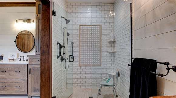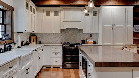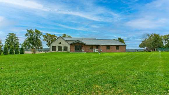 A Masterpiece! This amazing home sits high atop Buzzard Roost overlooking the winding Ohio River. The home sits on nearly 9 beautiful acres that adjoin National Forest land. The house is a fantastic mix of modern and rustic consisting of a Spencer County cabin from 1858 and new construction. Finishes are all top of the line with tiled showers, quartz countertops, solid wood doors, hardwood floors, and an abundance of windows to shower the home with natural light.The gorgeous home has 3 large bedrooms, each with its own bathroom. There is also a half bath conveniently located on the first floor. The Master suite is massive with french doors leading to a patio that looks out the beautiful back yard. This unique home has a loft with an open area that can be used for an office, entertainment space, or play area. The 3rd bedroom and bath are in the upstairs area as well, perfect for guest's privacy. The home has been built with convenience in mind as all door ways are ADA accessible and an elevator is located centrally to access all floors. An unfinished basement is also part of the home. It can be accessed by elevator or stairs. Outdoors you will find a 30 by 48 horse barn with fenced area, perfect for animals or storage needs. Don't miss the chance to see this amazing home. Come sit on the front porch and take in the view. The home is in a beautiful remote are yet still only about 60 minutes from Louisville, Ky.
