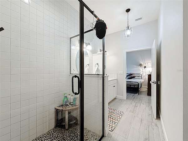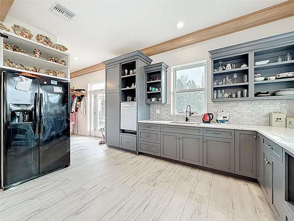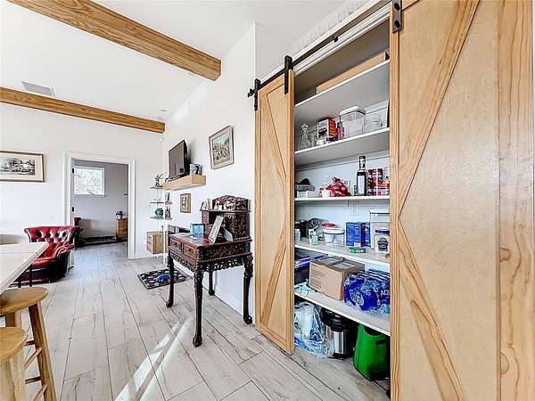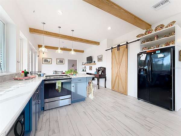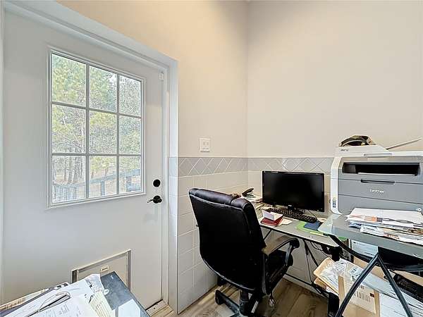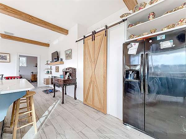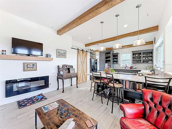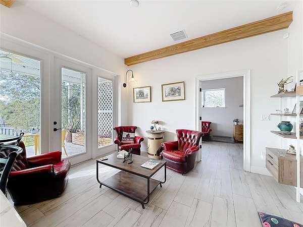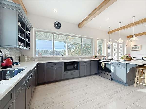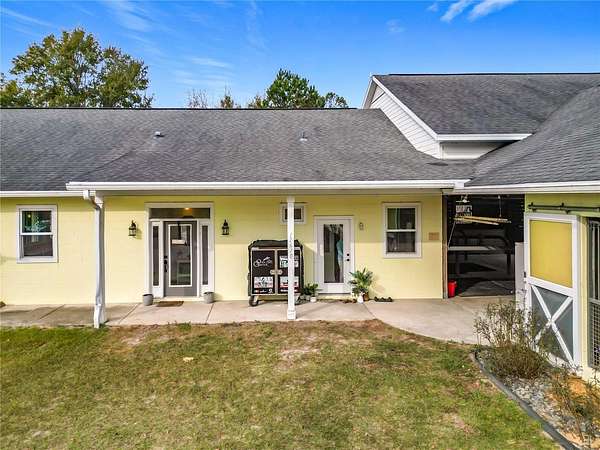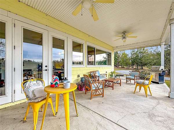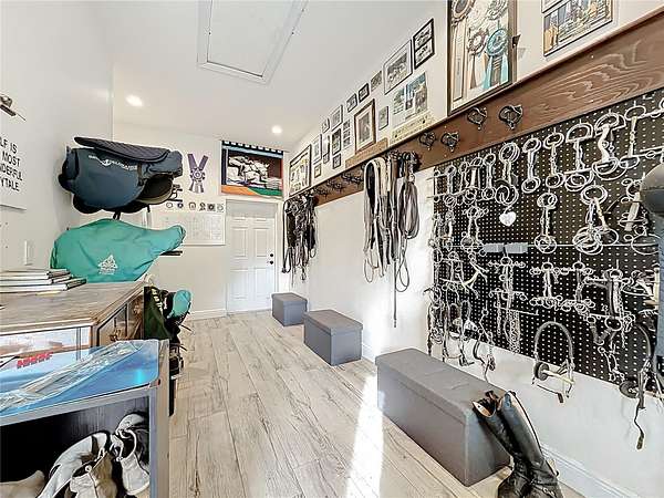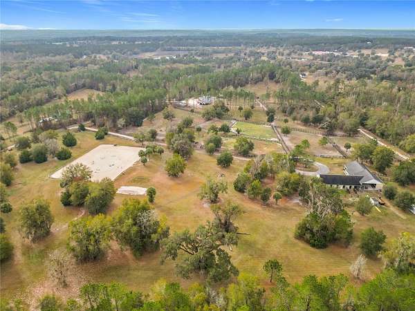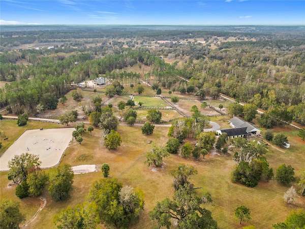 Welcome to Oak Grove Farm, a beautifully appointed 10+ acre equestrian property nestled within the gated, deed-restricted community of Hardwood Hollow in Reddick. High and dry, this unique farm blends rural living with serious equestrian functionality, featuring a custom-designed barndominium where the main residence and full-scale horse facilities are thoughtfully integrated under one roof. Zoned A-1, the farm is ideally suited for equestrian professionals, hobbyists, or anyone seeking a turnkey farm lifestyle with modern comforts. Built in 2018, the barndominium includes 1,400 square feet of living space, designed for both everyday comfort and entertaining. Inside, tall vaulted ceilings with wood-beam accents, large windows, and luxurious porcelain tile flooring creates a bright and welcoming atmosphere. A spacious, light-filled kitchen anchors the home with ample counter space and cabinet storage, stainless steel appliances, tiled back splash, spacious pantry with sliding barn doors, and a breakfast bar, all overlooking the serene pastures beyond. An electric fireplace adds warmth to the central living space, while the thoughtful layout, extensive storage, and a well-designed laundry area contribute to the home's seamless functionality. The primary suite is incredibly spacious with a large walk-in closet, direct access to the covered patio, and a private spa-inspired en-suite bathroom that features dual vanities, lots of storage, and a walk-in shower. Covered porches at the front and rear provide peaceful spots to enjoy sunrise and sunset views across the landscaped grounds. Connected to the residence is a professionally built 13-stall concrete block barn designed for efficient daily operation- ten of the stalls are 12x12', while the remaining three are approximately 12x14'. The barn includes a center aisle design with hot & cold water wash rack, tack and feed rooms, full bathroom, and a lounge space- perfectly suited for training clients or personal use. Eight large paddocks feature board fencing and gentle shade, with plenty of opportunity to convert for desired use. Hardwood Hollow offers residents access to the 3 and a 1/2 mile grass gallop track, and the property also rests adjacent to the mutually shared GGT arena with cross country fencing, saving you money from having to build your own. With no lease restrictions and current income potential, Oak Grove Farm offers flexibility for both personal use and equestrian business operations. Multiple sites on the property would work well for those looking to design and build a separate main residence, all while offering the opportunity to live on-property during the construction. Situated just an 8 minute hack on horseback from Sweet Dixie South and minutes from Majestic Oaks, as well as a short scenic drive from from HITS, the World Equestrian Center, and major highways, Oak Grove Farm delivers a rare blend of privacy, equestrian infrastructure, and rural living, all within one of Central Florida's most desirable equine communities. This is more than a home- it's a lifestyle, ready to be enjoyed from day one!
