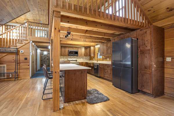 Inside, a warm open-concept layout showcases rustic character paired with comfortable modern living. Vaulted ceilings and a dramatic stone wood-burning fireplace anchor the main living area, creating an inviting space for gatherings or quiet evenings at home. The upstairs primary suite provides a private sanctuary, complete with a spacious bedroom, walk-in closet, and an updated en-suite bathroom.