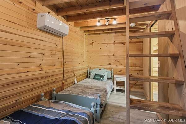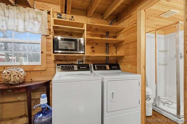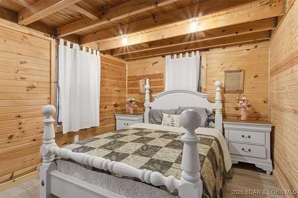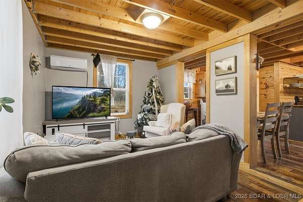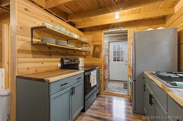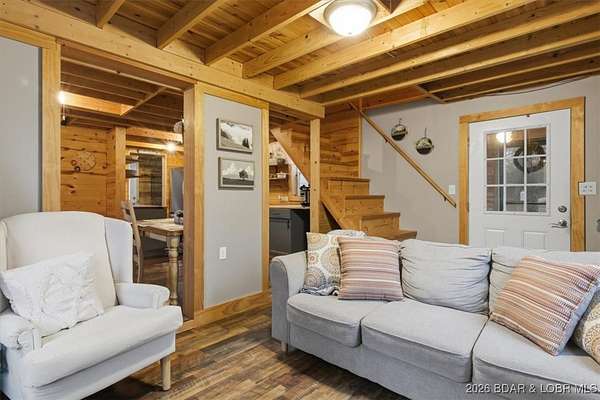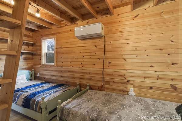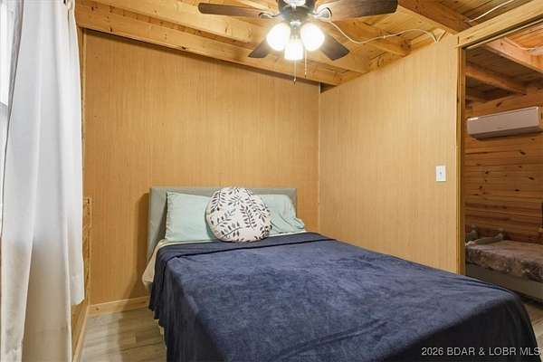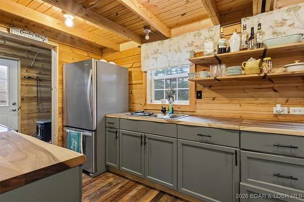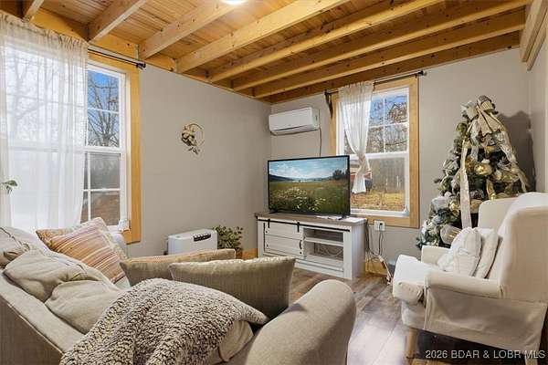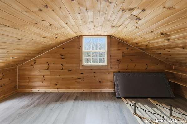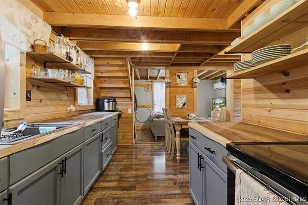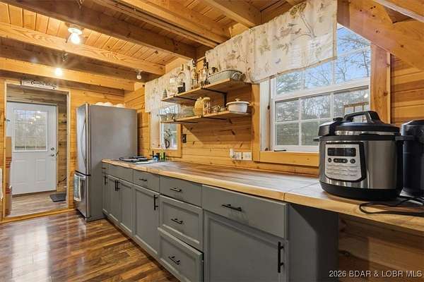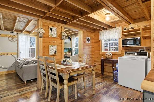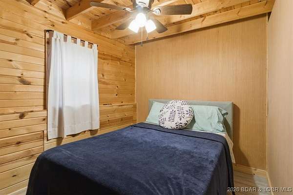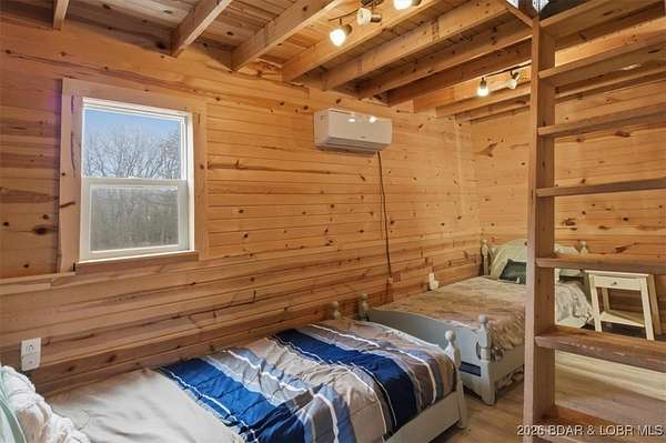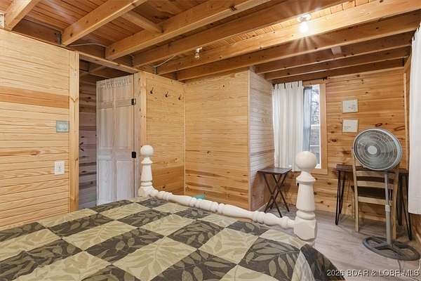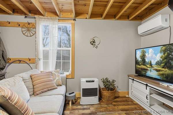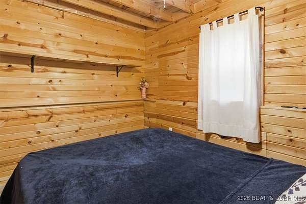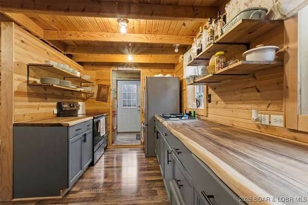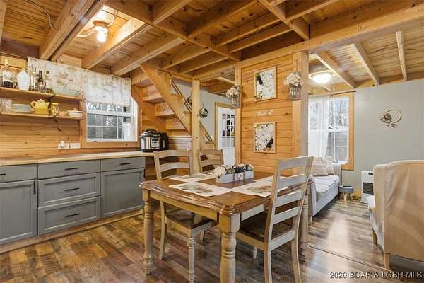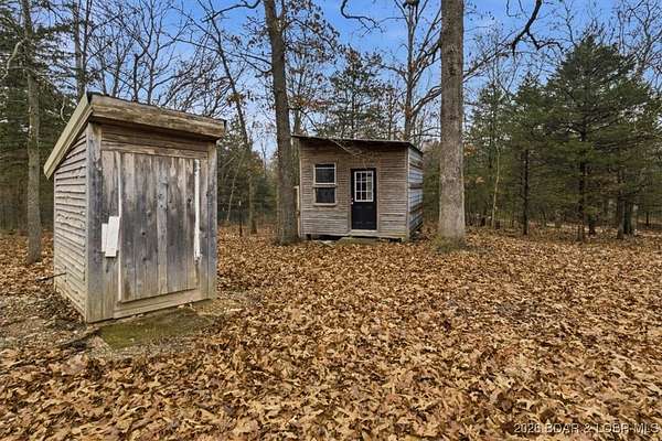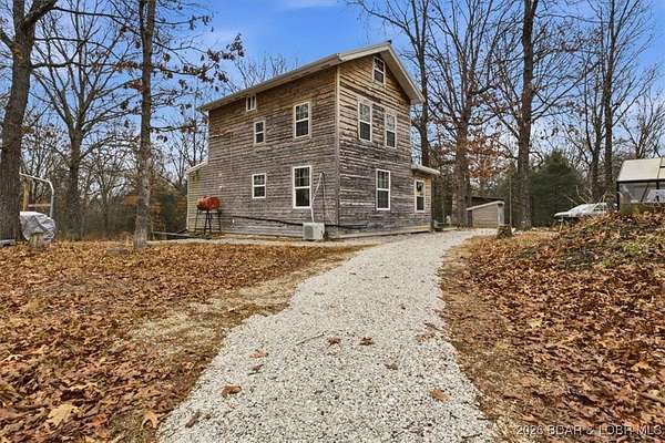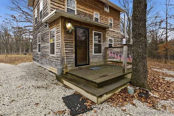 Tucked away on approximately 10 wooded acres just outside Cole Camp, this cedar-sided cabin offers privacy, functionality, and a well-thought-out setup for rural living. This three story home features roughly 1,200 square feet with three bedrooms and one bathroom, creating a unique and efficient use of space. Warm wood finishes throughout enhance the cabin feel. Heating is designed for efficiency and flexibility with a wood burning stove, electric mini splits and diesel heater. The upper level provides additional living or sleeping space. Infrastructure is already in place for a more self-sustained lifestyle. The 25x55 shop with a concrete floor offers excellent workspace and storage, complete with separate back room and loft that could be finished for additional use. Multiple outbuildings, a greenhouse, fenced garden area with raised beds, chicken coop, and a storm shelter add to the property's functionality. The setting is quiet and private, yet still accessible, and located within the Cole Camp School District. This is a well-maintained property suited for those seeking a secluded retreat, hobby farm, or off-grid-inspired lifestyle with improvements already in place.