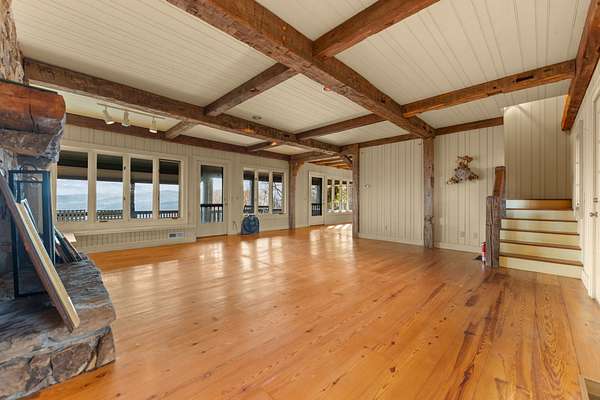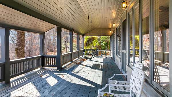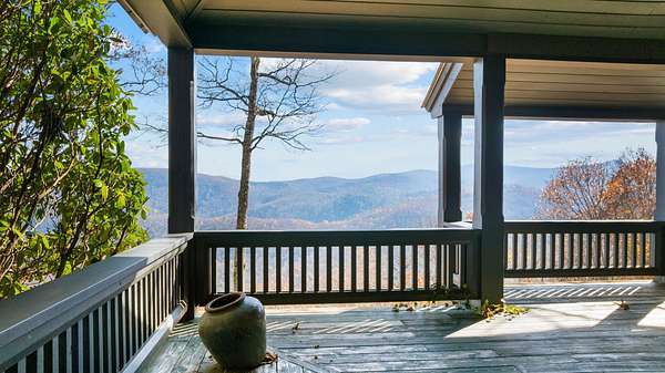 Located high atop a ridge about 7 miles from Main Street in Highlands, this diamond in the rough is sitting upon 15 acres with stunning mountain vistas. The land is flat and usable, limited to one lot for a private estate. The house is ready to make to your own personal tastes and has great charm with heart of pine floors, huge antique beams in the coffered ceiling, and a stone fireplace that graces the living room. The Living room opens up to a full wraparound porch to enjoy the breeze and mountain vistas from several directions. Kitchen is functional and ready to be renovated to your personal tastes. Main floor Master with ensuite bath. Upper level has 2 additional guest rooms with views and ensuite baths. Detached garage has a bay with workshop storage room and a full upstairs efficiency apartment.