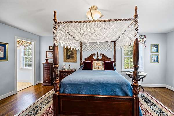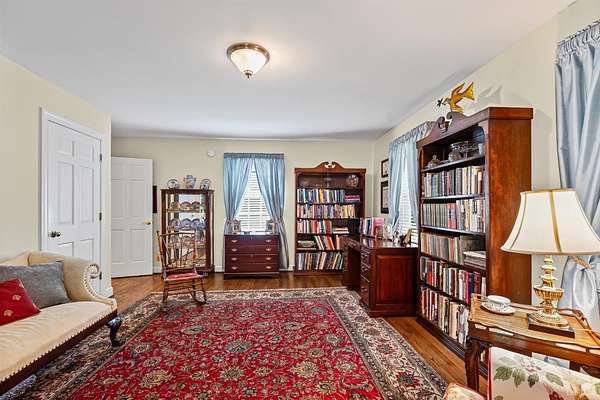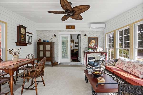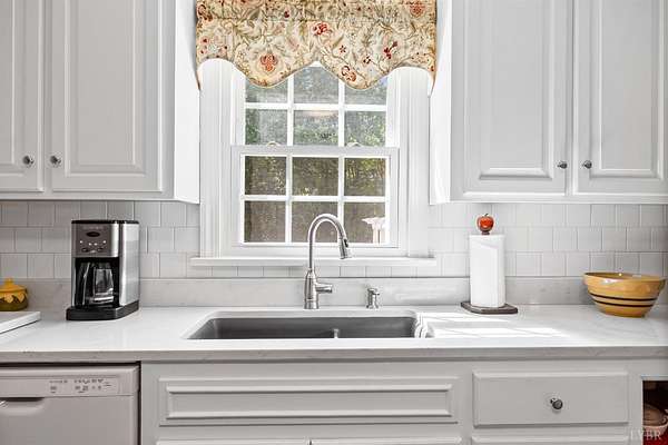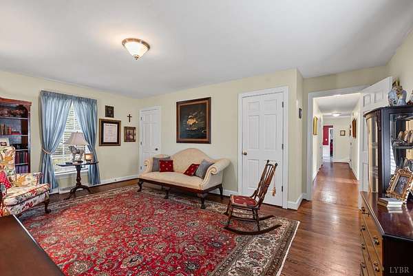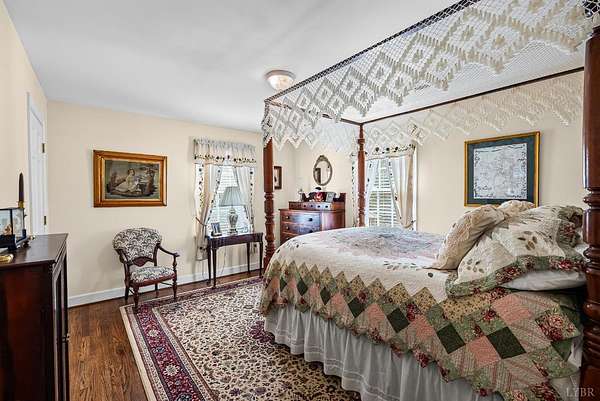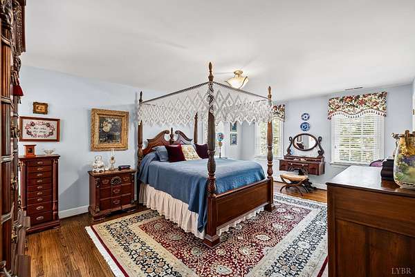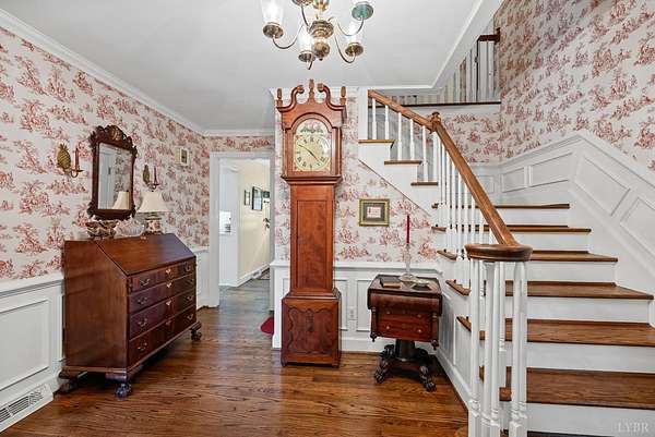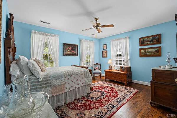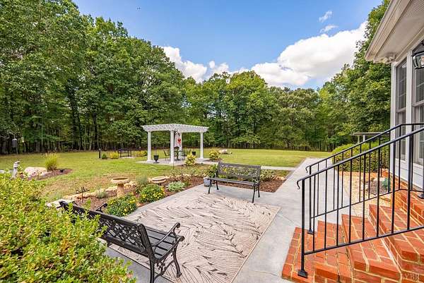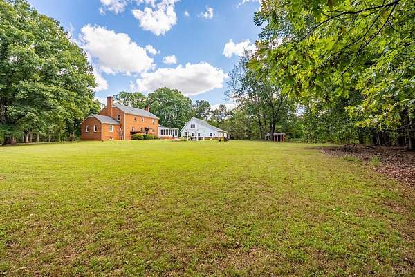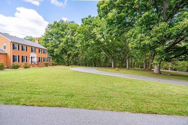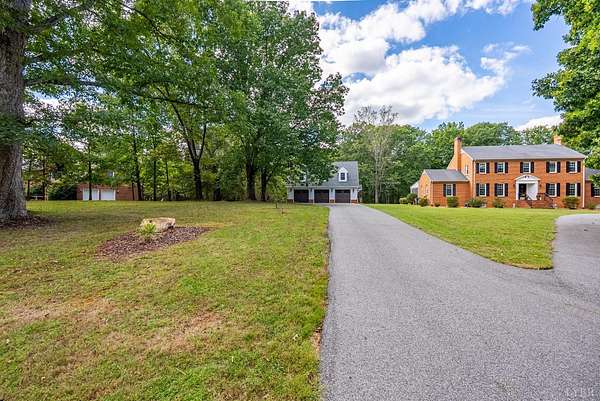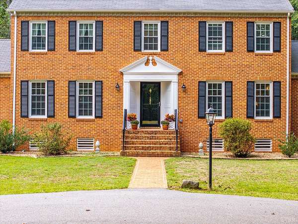 Immaculately maintained 1973 brick Georgian Revival set on 2 beautiful acres with timeless curb appeal and privacy. This 5-bedroom, 3-bath home features a formal foyer with designer wallpaper, elegant hardwoods, formal living room with fireplace and formal dining room. The renovated kitchen opens to a cozy den w/ gas log fireplace, built-ins, and detailed moldings, plus a newly added 15x15 sunroom overlooking manicured grounds. Main-level bedroom with full bath and laundry. Upstairs includes a spacious primary suite with en-suite bath, three additional bedrooms, and another full bath. Full unfinished basement offers extra storage. Outdoor living includes a pergola, stone patio, brick walkways & mature trees. Circular paved drive leads to new 40x45 three-bay brick/ hardie plank garage/carriage house with second level. New windows, gutters, and well pump. Recent upgrades of $286,000. Property backs to protected Monacan Indian Reserve ensuring lasting privacy. Priced under tax assessment.