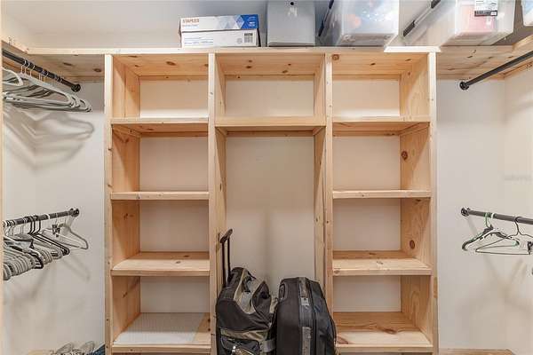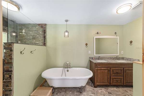 Primary suite with walk-in closet, custom shelving, a luxurious bathroom featuring a clawfoot tub and walk-in shower.