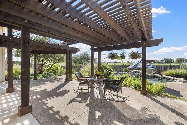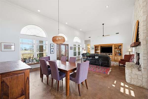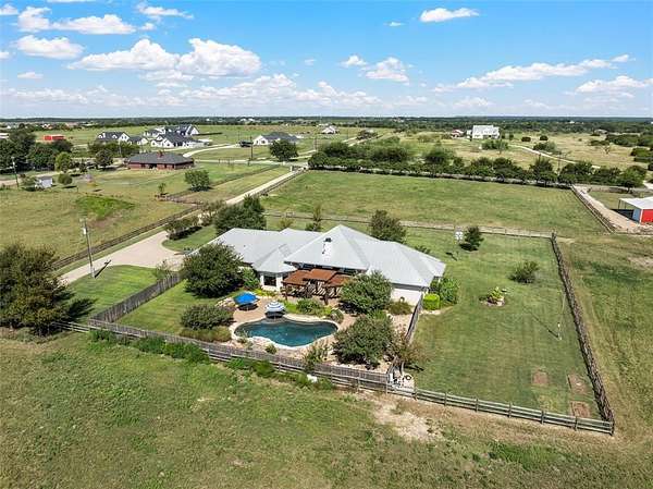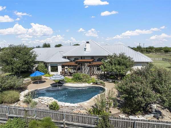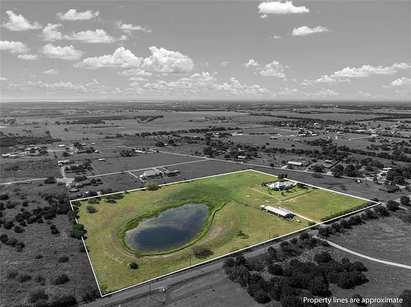 This exceptional property offers everything you could desire and more. 12 picturesque acres, a beautifully appointed 4-bedroom, 3-bath stone home, a serene pond, saltwater pool, and a multipurpose shop, all ideally located within a highly rated school district. As you pass through the gated entrance, the drive home is a pleasure, with wide-open views leading you to the welcoming residence. Inside, the 2,622-square-foot home is filled with warmth and character, featuring raised ceilings and an open living and dining space anchored by a beautiful stone, wood-burning fireplace. Thoughtfully chosen fixtures and expansive windows bathe the rooms in natural light and showcase the surrounding views. The kitchen is truly the gathering place, updated with Bosch appliances, an oversized island, an induction stove, generous cabinetry, and a cozy breakfast nook framed by a wall of windows overlooking the backyard. It's a space made for morning coffee, family meals, and lingering conversations. The primary suite offers a quiet retreat, complete with an updated, spa-like bath featuring a soaking tub, large shower, dual vanities, and a spacious closet. Windows overlook the pond and open acreage, creating a sense of calm to start and end each day. Outside has enjoyable front and back patios. The saltwater pool is perfect for long summer days, while the propane fire pit sets the scene for evenings spent under the stars. Native Texas landscaping surrounds the home, ready to return in full bloom, and a newly fenced backyard adds much charm. The land itself is something special. Spend your days tinkering in the shop, fully equipped with water and electricity, casting a line into the pond, or watching ducks drift across the water. Whether it's a quiet swim, a sunset by the fire, or simply enjoying the sounds of nature, this property offers a slower pace and a sweeter way of living. This is the kind of place where memories are made, roots are planted, and home feels exactly as it should.