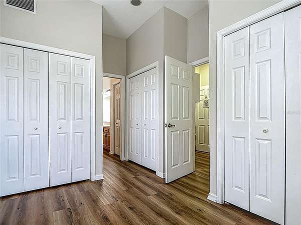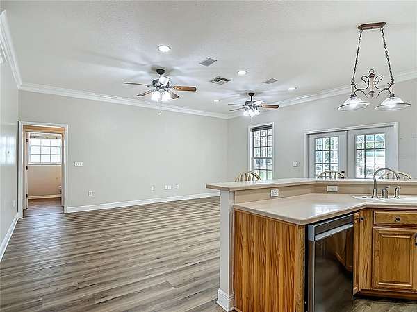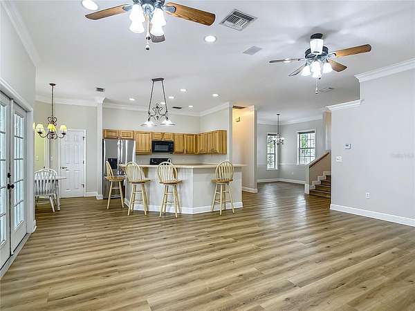 - Crown Molding, Eat-In Kitchen, High Ceilings, Open Floorplan, Primary Bedroom Main Floor, Solid Surface Counters, Solid Wood Cabinets, Thermostat, Walk-In Closet(s)