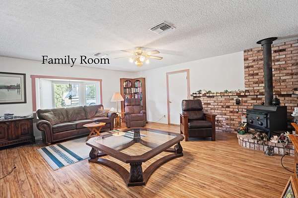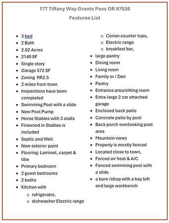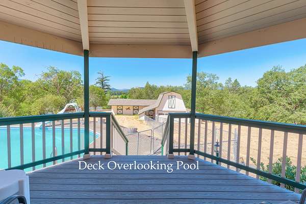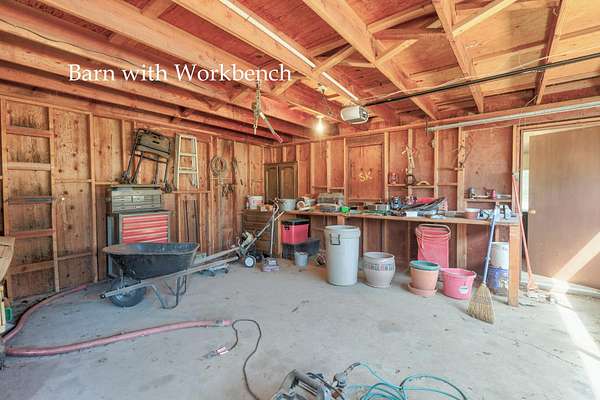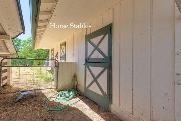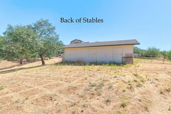 Built in 1976, this single level, 2,140 sf home, with a primary bedroom and 2 guest bedrooms, 2 baths. with an open floor plan, sits on 2.62 acres and is close to town, Forced air heat & A/C. There is an oversized 2 car garage, fenced swimming pool with a slide, a barn /shop with a hay loft and large workbench. Horse stables with 3 individual stalls. The interior of the home includes a kitchen with Corian counter tops, breakfast bar, electric range, refrigerator, dishwasher large pantry. Also a dining and a living room with wood burning, brick fireplace. There is a large den/family room with enclosed laundry area, a built-in desk and a large bookcase. Ceiling fans in most rooms. There is an enclosed, screened deck off the dining room and a patio off the pool area. There is a pond in front of the house. The Exterior of home recently painted. Firewood in the stables is included. Seller offering a $5,000 concession for carpet and GFI repair. Inspections have been done.