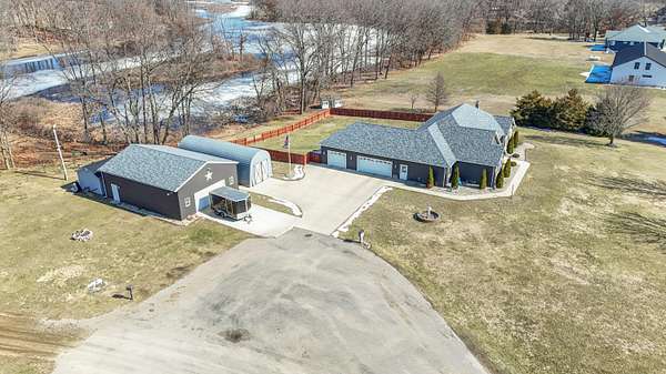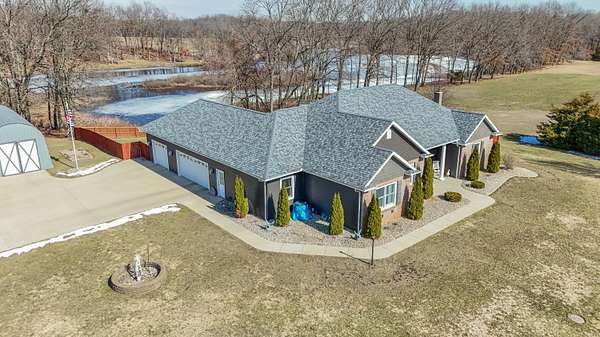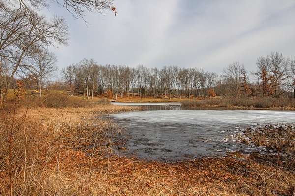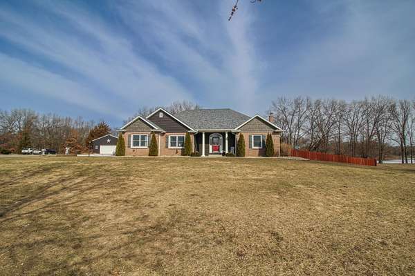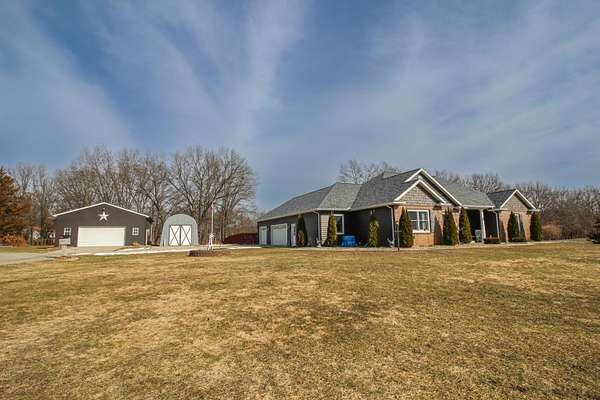 Outstanding 4 Bed, 3 1/2 Bath Walk-out Ranch on 4.18 acres with pond frtg. The main level open-concept living space with a FP is complemented by a gracious, well-appointed kitchen w/solid surface countertops and a very generous prep area. The kitchen is furnished with an island for add'l serving space. Further exploration of the main level reveals a lovely and separate breakfast/lunch area. More searching turns up an amazing primary suite with a full bathroom, a large sleeping rm and generous storage. The 2nd and 3rd bedrooms share a second full bathroom. A final high point of the main level highlights a dedicated laundry with trendy front-load machines. The full basement is mostly finished and large enough for the addition of another bedroom or office space. There is currently a finished, nicely sized, egressed bedroom near a full bathroom. The basement storage room could also be considered flex space. The attached 3 car garage is well insulated with a 1/2 bath. Now, let's check out the third garage stall, which has been outfitted with useful cabinets, which will be left for the Buyer. Moving along, step outside. You'll be amazed by the beauty of nature and the space to enjoy it, including a good-sized deck with a fully fenced backyard for relaxing. Consider all you can do with the bonus, detached shop, set up with ample lighting and heat. Wait, there is more, a huge Quonset-style bldg. now used as cold-storage. A third outbuilding, a shed, has electric (which feeds from the shop), and the fourth outbuilding, near the pond, is for storage of toys, etc. Newer to this home: roof, siding, insulation, furnace, central air, and basement flooring. All details provided, including dimensions and tax info. should be verified by the Buyer.