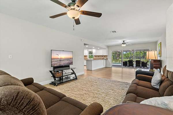 Inside, the split floor plan provides flexibility with multiple living and dining areas--perfect for entertaining or working from home. The primary suite offers a walk-in closet, updated en suite bath, and private lanai access, while the guest bedrooms and remodeled bath provide comfortable accommodations.