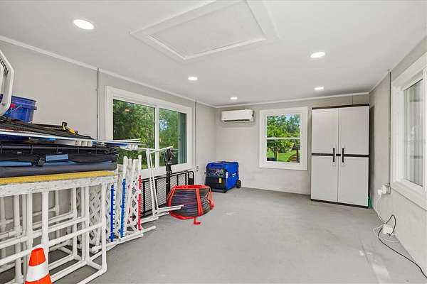 Step outside to enjoy the sparkling saltwater pool and expansive screened lanai overlooking the massive fenced backyard. The extended driveway, 20x35 RV pad, and oversized two-car garage provide ample room for boats, trailers, and Florida toys, with a large shed for extra storage. An additional 11x15 block outbuilding, complete with new windows, recessed lighting, and a new A/C mini-split--makes an ideal office, gym, playroom, or studio.