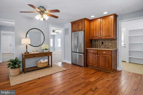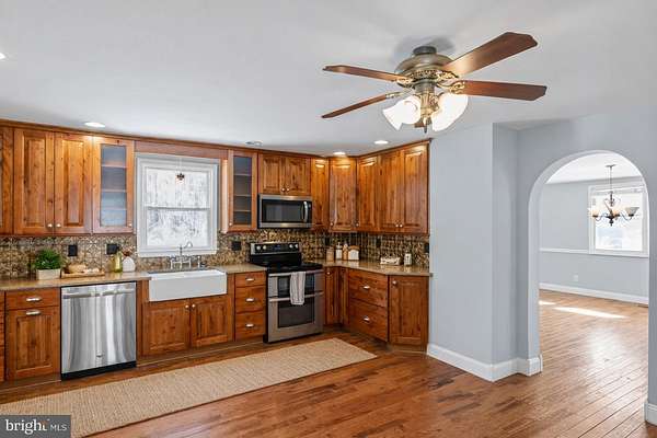- Ceiling Fan(s), Country Kitchen, Crown Moldings, Dining Area, Eat-In Kitchen, Pantry, Pellet Stove, Soaking Tub Bathroom, Stall Shower Bathroom, Table Space Kitchen, Upgraded Countertops, Walk-In Closet(s), Window Treatments, Wood Floors