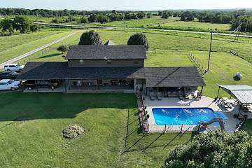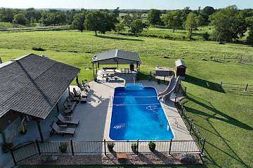 Welcome to your private retreat just off the highway, where a new gated entrance welcomes you home. This stunning approx. 3,500 sq. ft. home features 4 bedrooms and 3 bathrooms, designed with an open-concept layout and a spacious living area filled with natural light from large windows that frame the beautiful outdoors. In 2019, a bonus room was added, along with a saltwater inground swimming pool, perfect for relaxing or entertaining on warm Oklahoma days. The property includes a 2,600 sq. ft. metal shop with an attached awning ideal for equipment, hobbies, or additional storage. The 55 acres offer more than just land, this is a landscape full of character, with rolling hills, elevation changes, and terrain that feels expansive and dynamic. You'll find several large, producing pecan trees, two seasonal creeks, and two ponds, making this a haven for both livestock and wildlife. Currently supporting 15 head of cattle, the property is fully functional for agricultural use or ready for your own vision of country living. Conveniently located just over 30 minutes from both Durant and Ada, offering the perfect blend of rural privacy and easy access to town.