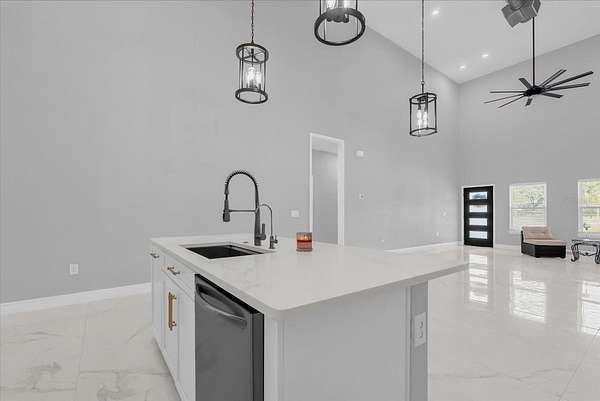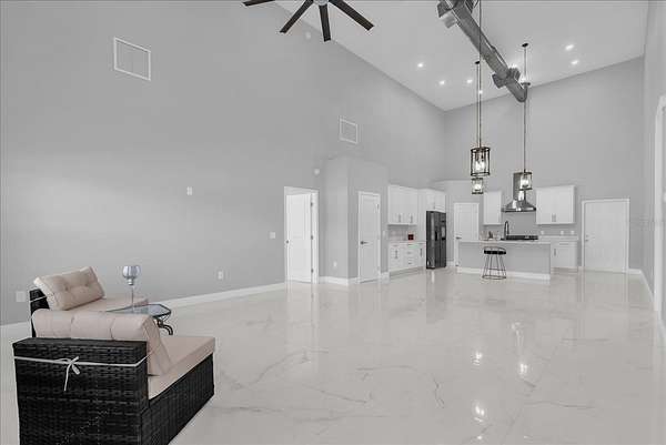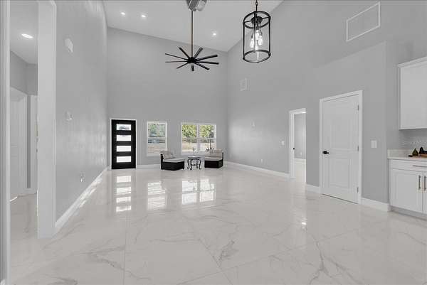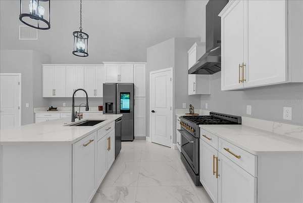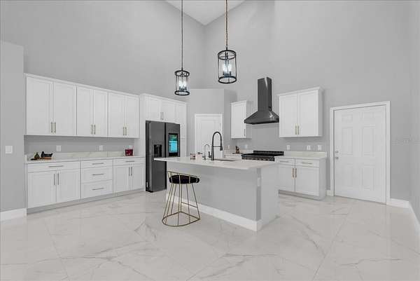 The kitchen and dining area are highlighted by dramatic 19-foot ceilings, upgraded California-style countertops, 42 inch tall cabinets and a 36-inch gas range with six burners, ideal for both everyday living and entertaining. Ceramic tile flooring flows throughout the home, complemented by a two-door Samsung refrigerator, gas water heater, gas dryer, watwer softener for the whole house with 3 layer filtration and a 500-gallon propane tank.