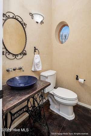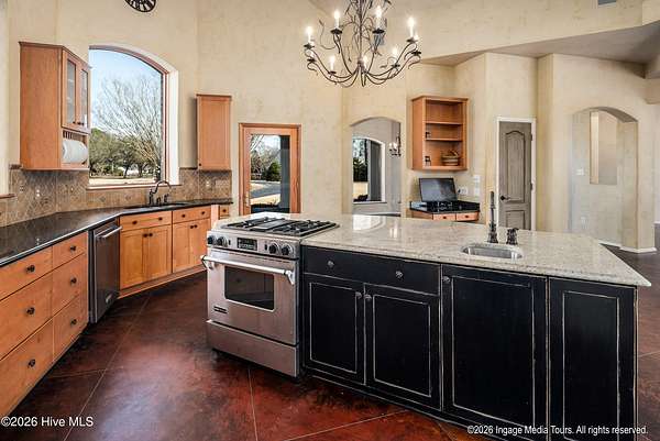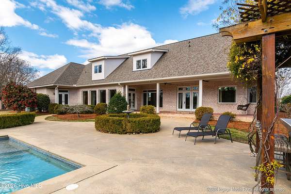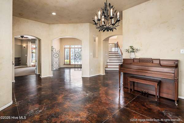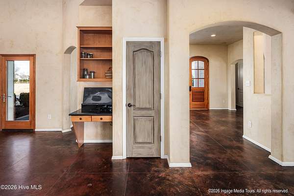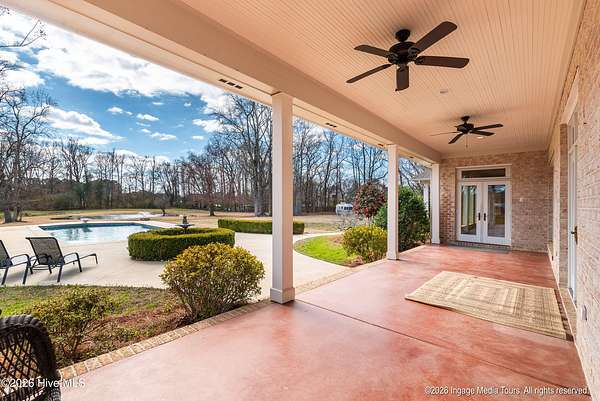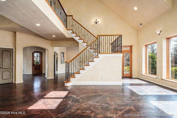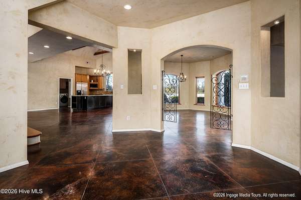 One of the most architecturally distinctive homes to ever hit the market in our area, this custom-built estate offers durability, design, and resort-style living on 6 unrestricted acres -just minutes from the hospital & major roads. Constructed with insulated concrete form walls & stained concrete floors & finished smooth plaster-style interior reminiscent of Mediterranean architecture, the home features long, low windows that flood the interior with natural light. Deep natural hardwood window sills add warmth & character throughout. The open floor plan is anchored by a dramatic two-story fireplace in the den. The chef's kitchen includes granite countertops, high-end appliances, custom cabinetry, & a stunning center island designed for gathering. A formal dining area flows seamlessly into the main living space. The main level offers three bedrooms, each with a private bath. The primary suite features a walk-in tile shower with steam, jetted tub, and dual vanities. One guest suite includes private access to the pool area. A third bedroom with adjoining bath could serve as a second primary suite or ideal mother-in-law quarters. Upstairs includes a fourth bedroom with private bath, spacious bonus room, theater room with wet bar, sink, & mini fridge, plus an additional bonus space perfectly sized for a pool table. A large walk-in attic provides excellent storage or future expansion potential. Outdoor living rivals luxury resorts. The gunite, saltwater pool is complemented by a pergola & outdoor kitchen/grilling area. A brick pool house keeps equipment neatly tucked away. The fenced backyard includes a greenhouse with five brick-enclosed raised beds & irrigation, along with fig, pecan, grape, pear, & apple trees & a pond w/ fountain With 6 unrestricted acres, there is ample space for privacy, recreation, & even horses if desired. A truly one-of-a-kind Mediterranean-inspired estate where no detail was overlooked.