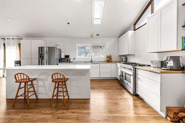 Stake your claim on this extensively remodeled 4BD/2BA home with 2,200 SF of living space on 3.24 acres! The property is well-suited for both recreation & self-sufficiency, featuring a heated 30'x48' shop, an impressive 40'x60' enclosed garden with over 20 raised beds producing flowers, herbs, & vegetables, a storage shed for garden tools or easy conversion to a chicken coop, mature trees, shrubs, fruit trees, and more. Recent upgrades include a remodeled kitchen, updated flooring, appliances, interior paint, & more. Abundant windows fill the home with lots of natural light and frame beautiful mountain views. Expansive front and backyards provide ample room to garden or relax, with a fenced backyard for added convenience. Enjoy a beautiful seasonal irrigation canal w/ a pump. No HOA, no CCRs, unzoned, & accessed by a county-maintained road. Enjoy privacy while remaining just a short drive to Missoula's amenities, w/ four-season recreation only minutes away! See Feature Sheet in Docs.