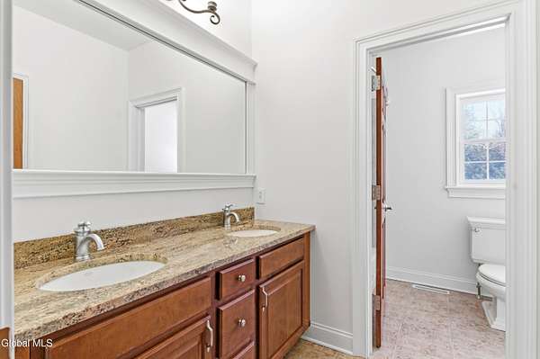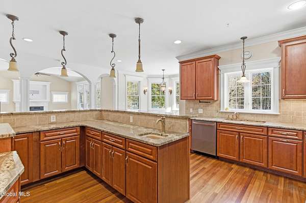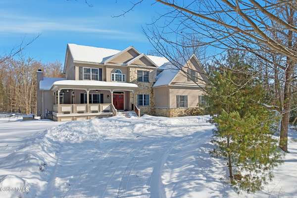 Nestled on 6.13 acres and set back off the road for a private setting, this home impresses with a stunning wrap-around covered porch featuring paddle fans and recessed lighting. Inside, a grand 2-story foyer welcomes you into this 3,473 square foot home with an additional 1161 square feet in the walk-out in-law apartment! Brazilian cherry floors, solid mahogany doors, arched entryways, and exquisite crown molding and custom casings create a timeless elegance throughout. The formal dining room features a tray ceiling, while the family room showcases a cathedral ceiling, cottage-style windows, and a Vermont Castings wood-burning stove. The kitchen boasts maple cabinetry, granite countertops, and a breakfast nook with access to a Trex deck overlooking the fenced backyard. The first floor also includes a guest bedroom with a full bath as well as a versatile office or playroom with French doors leading to the front porch. Upstairs, the primary suite features a cathedral ceiling, sitting area surrounded by windows, expansive walk-in closet, and a luxurious bath with soaking tub, double vanity, makeup station, and tiled walk-in shower. A second-floor laundry room adds immeasurable convenience. The walk-out lower level offers a family room lined with 7 floor-to-ceiling windows, eat-in kitchen, bedroom, office, full bath, laundry hookups, new carpeting, and glass doors to a covered patio. Thoughtful features include a four-zone AirBoss heating system, central air, generator, and a brand-new leach field, making this home a rare blend of luxury, comfort, and peace of mind.