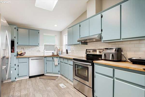 - Dishwasher, Free Standing Range, Pantry, Plumbed For Ice Maker, Range Hood, Stainless Steel Appliance, Tile