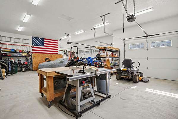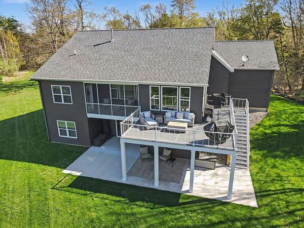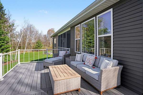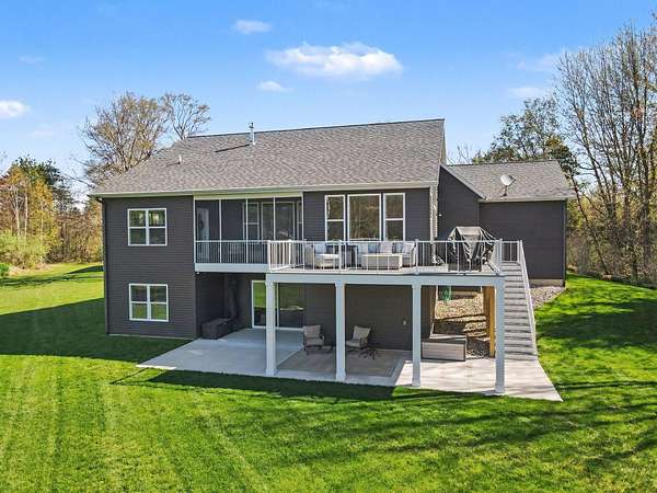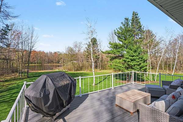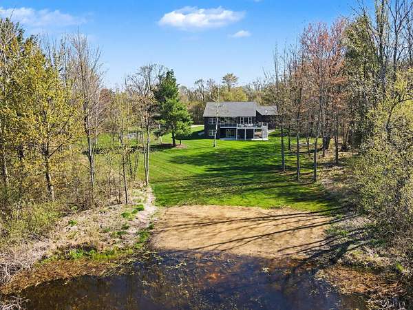 Welcome to your private slice of paradise! Don't miss out on this meticulously maintained and stunning 4-bedroom, 3-bath ranch-style home offering main-floor living at its finest. The thoughtfully designed layout features a spacious kitchen, primary suite, and laundry all conveniently located on the main level, making everyday living effortless and comfortable. The walkout lower level is built for entertaining and relaxation, complete with a beautiful home theatre featuring comfortable leather recliners--perfect for movie nights or cheering on your favorite teams. This level also includes a bar area, a generous living space, and three additional bedrooms, one of which is currently set up as a workout room with durable rubber flooring. Step outside and experience everything this incredible property has to offer. Situated on over 10 acres, the home overlooks your own private body of water, complete with a sandy beach area for enjoying warm summer days. The beautifully landscaped grounds are designed to maximize the stunning water views from every angle. A new composite deck off the back of the home provides the perfect space for entertaining, while a private 3-seasons room off the primary bedroom offers a retreat for morning coffee. Additional exterior features include a 3-stall garage with brand-new epoxy flooring and a versatile bonus room above--ideal for a mother-in-law suite, office, or craft space. A newly built, heated outbuilding with three stalls is perfect for a workshop or hobbyist setup. For those who love to garden, you'll appreciate the fully fenced garden area complete with its own drip-line irrigation system. With its serene setting, expansive acreage, and exceptional amenities, this property offers the perfect blend of luxury, privacy, and functionality--truly a rare opportunity to escape the hustle and bustle while still having everything you need right at home. Buyer and buyer's agent to verify all information.