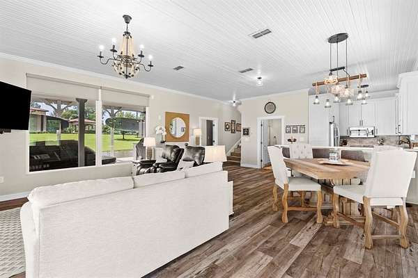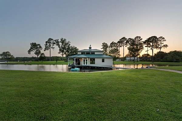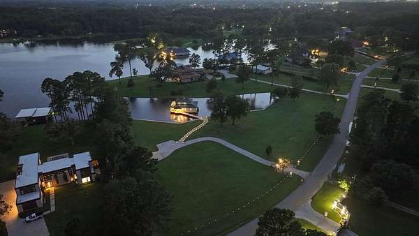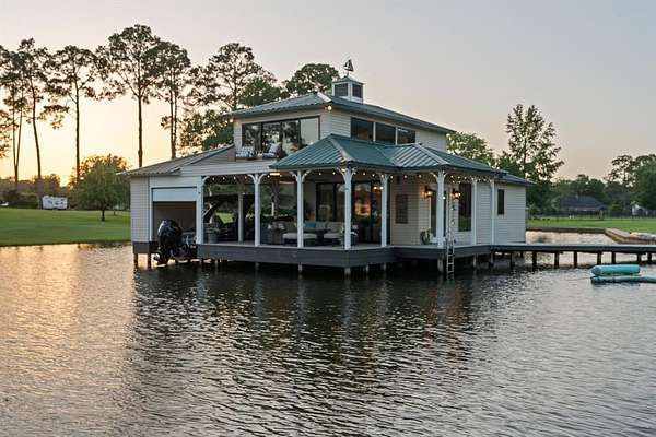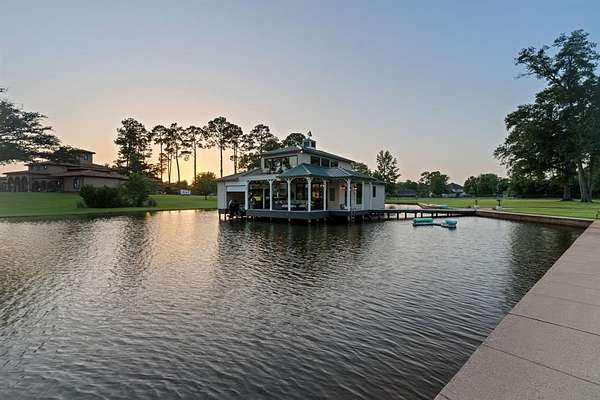 A wide lot ensures total seclusion, while manicured Zoysia-Bermuda grass and a full smart irrigation system enhance the landscape. Approximately 500 feet of iron fencing with solar lighting, a stately smart-gated entrance, featuring rock columns with hard-wired color-changing smart bulbs that glow at night, and concrete driveways create a polished first impression. A beautifully lit cart path leads you down to the water, where you'll find the impressive boathouse.