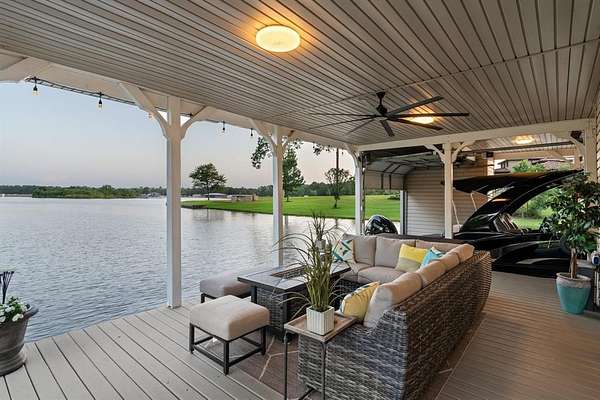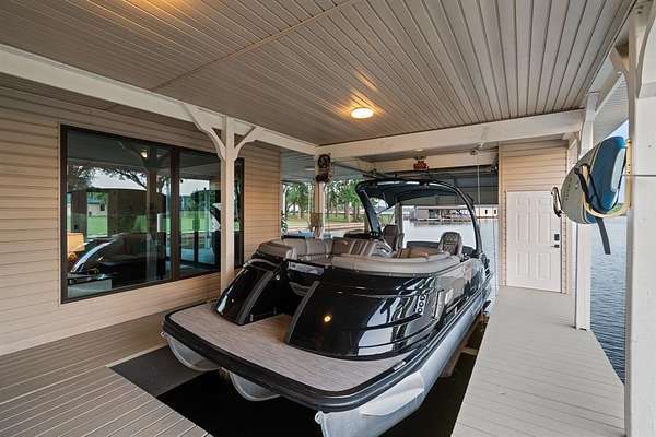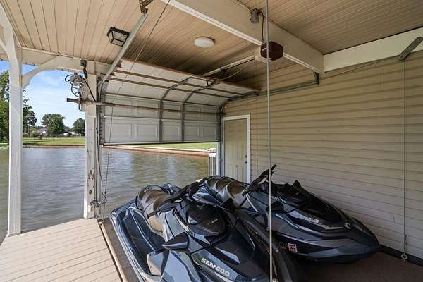 Approximately 400 feet of prime shoreline with a concrete bulkhead and a sidewalk along the water's edge, nestled in an essentially private cove with expansive open water views. The covered boathouse includes a boat lift and watercraft lift, complete with a Gem remote and garage doors for privacy and wind protection.