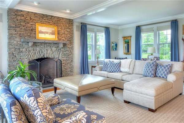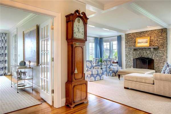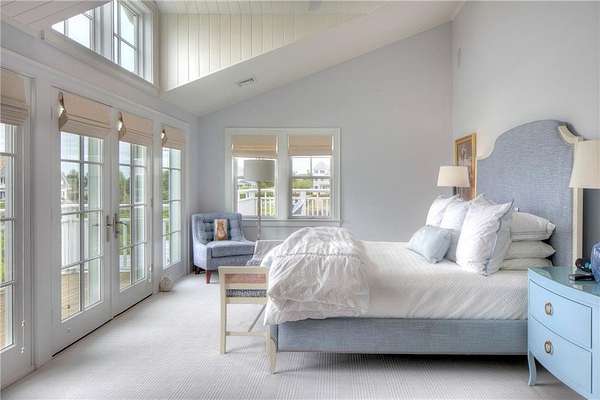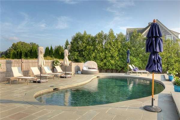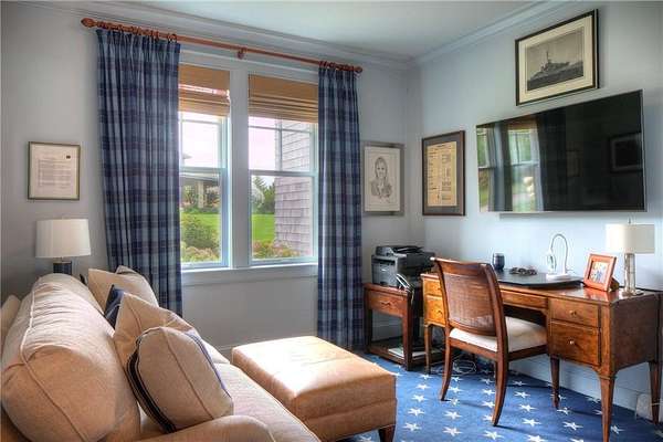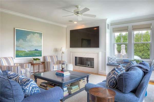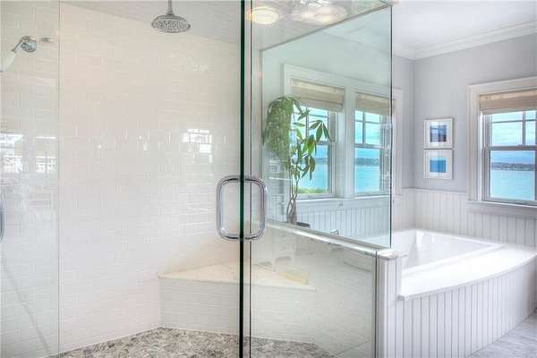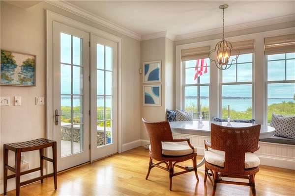WATERFRONT Nantucket Shingle Style beautifully sited to take advantage of fabulous west/southwest Narragansett Bay sunset views and the wonderful southwesterly sea breezes. The perfectly appointed sun filled south and west facing kitchen/sitting/dining area with gas fireplace has views over the stone terrace to the swimming pool and bay. A spacious living room with deck, stone fireplace and adjacent formal dining room both have expansive bay, pond and marsh views. The second floor with five bedrooms all with ensuite baths, includes a primary with steam shower, two large walk-in closets and deck and two guest bedrooms with water views. A fourth guest bedroom and expansive family bedroom along with a laundry complete second level. The lower level includes a gym, sauna, 2 more sets of washer/dryers, full bath, plenty of storage and a walk out entry to swimming pool area. Utilities include a whole house generator. A three-car garage has space for 3 golf carts and two full car spaces. Set on 1.75 acres within a private gated estate, the buyer may choose to join the Aquidneck Club to enjoy exceptional clubhouse dining, golf course, tennis, marina, and equestrian facilities. The residence was masterfully built by Behan Construction with upgrades by Horan Construction - it is turn-key and absolutely PERFECT! Separate 40 Foot marina slip for sale in the neighborhood.