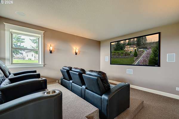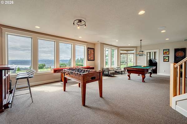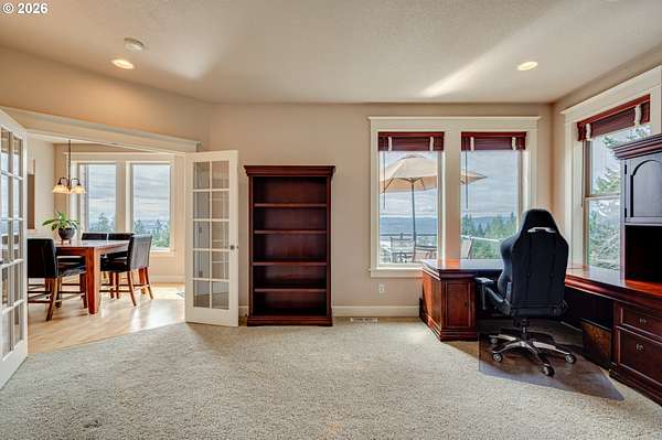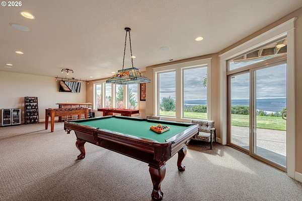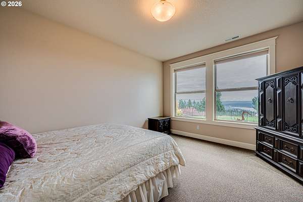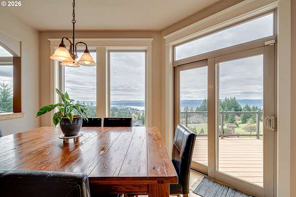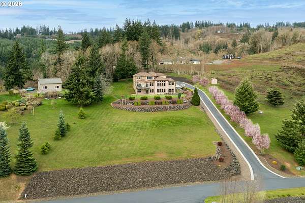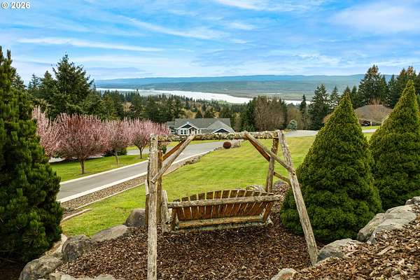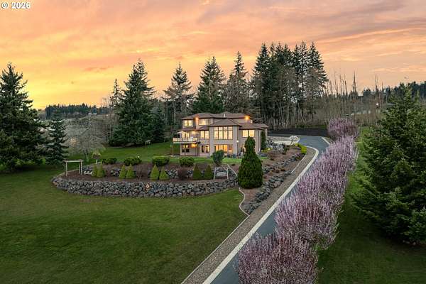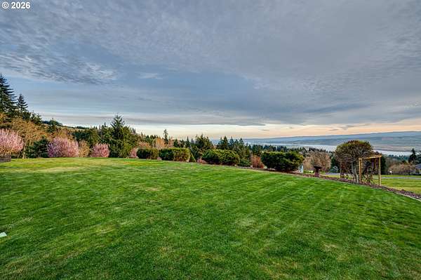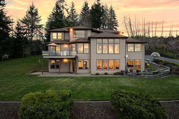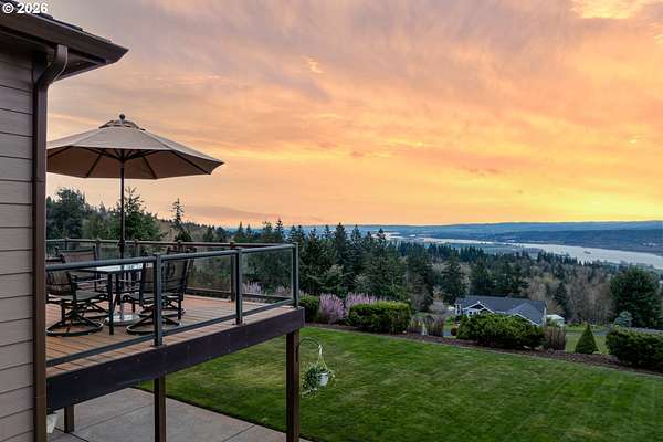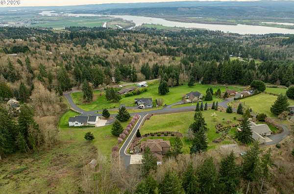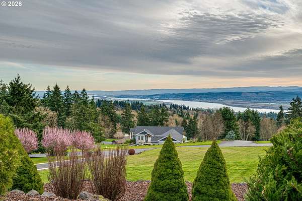 Custom home with sweeping Columbia River, city, and valley views. Nearly every window is positioned to capture natural light and the views. One owner home that has been meticulously maintained. Expansive floor plan offering over 4,580 square feet with 5 bedrooms, an office, flex space, bonus room, and theater room. Gourmet kitchen features granite countertops, cherry cabinetry, gas appliances, walk-in pantry, and it is open to the main living areas. Walkout basement extends to a concrete patio and is plumbed for a future hot tub. Tri level HVAC zoning provides efficient and comfortable climate control throughout. Thoughtfully designed property with paved driveway, 3 car attached garage, RV parking, and generous additional parking. Electrical panel in place for future shop. Serene setting enhanced by a handcrafted koi pond. Located just 40 minutes to PDX and under 10 minutes to I-5.