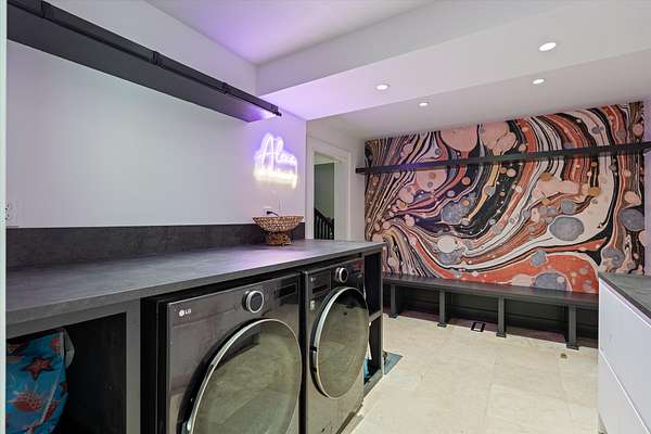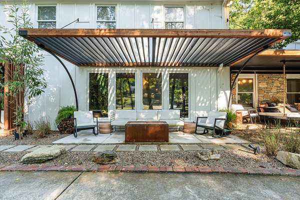 Front and rear outdoor living areas extend the home's design sensibility outward, blending mid-century form with modern functionality. A bridged circular drive welcomes guests with a touch of stately charm while providing ample parking and a two-car garage with generous storage.