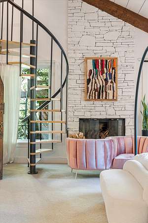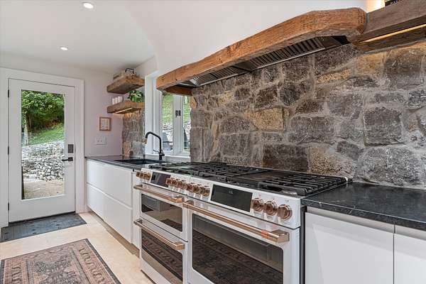 Inside, the 5,002-square-foot layout unfolds with warmth and intention -- layered textures, natural light, and thoughtful scale at every turn. The main-level primary suite rises under cathedral ceilings with exposed beams, a fireplace, and an intimate loft, creating a retreat that feels both grounded and romantic. The kitchen is a showpiece of material contrast -- limestone walls, a curved hand picked/placed zellige-tile island, open shelving, and striking architectural beams -- connecting effortlessly to multiple living and dining spaces defined by tone, texture, and curated personality.